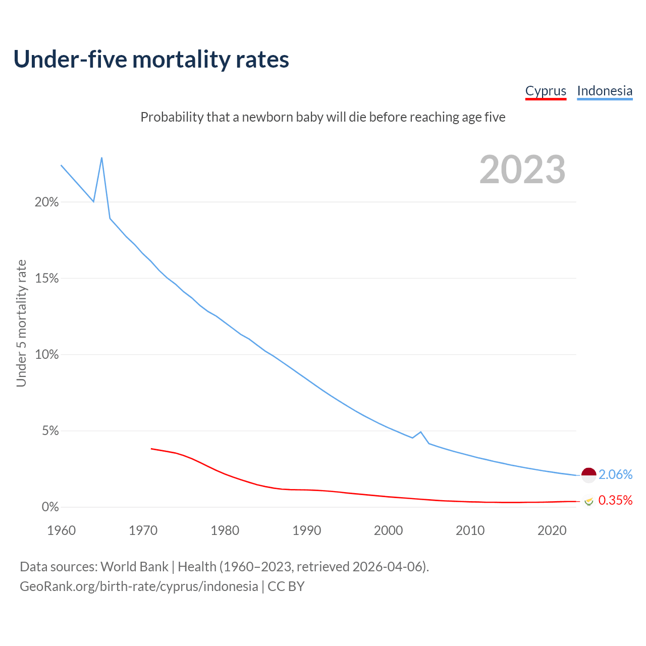 The chance that a newborn baby will die before reaching age five is 0.35% in Cyprus and 2.06% in Indonesia. Above is a chart with historical data on under-five mortality rates.