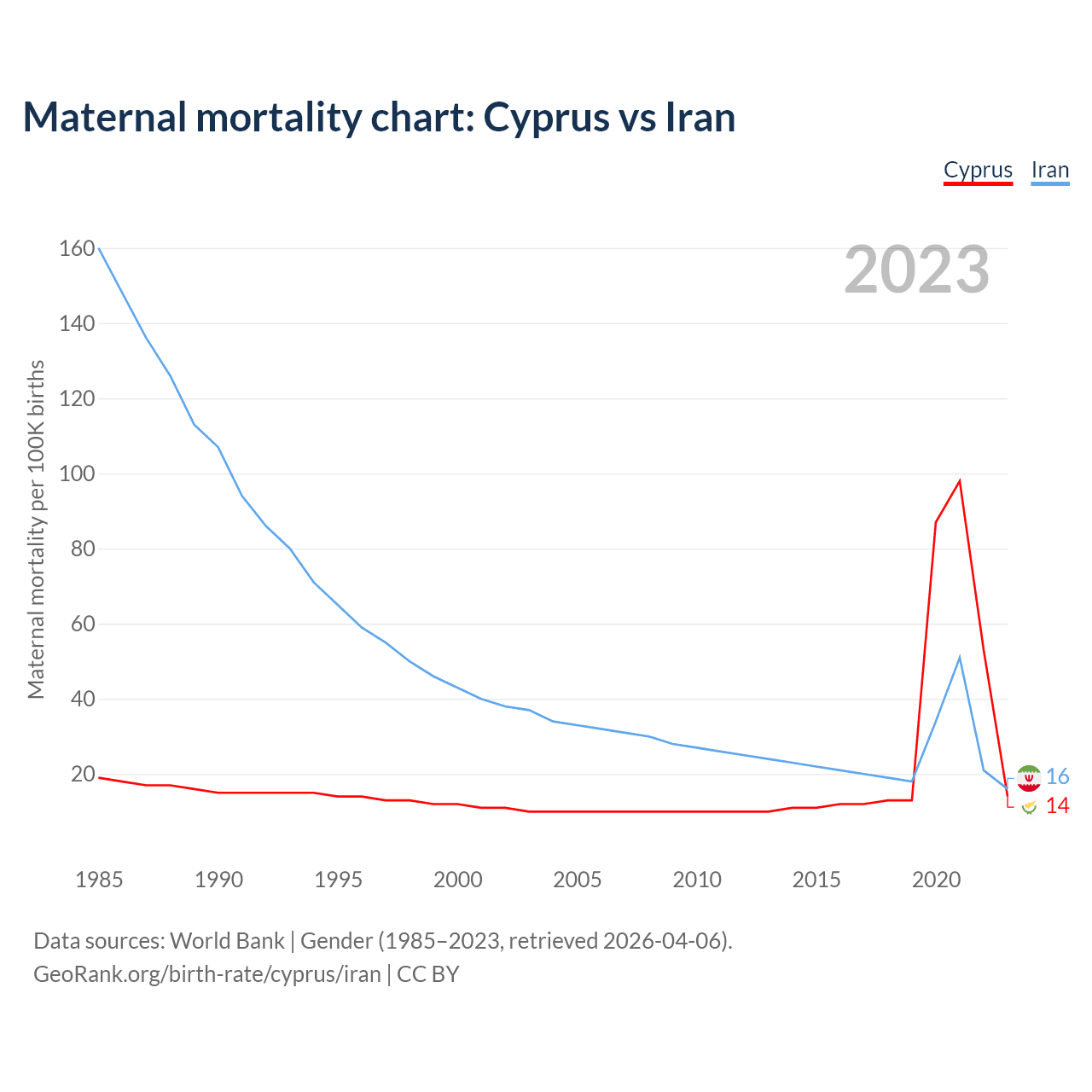The maternal mortality rate, which is the probability of dying during childbirth or within 42 days of pregnancy termination, is 14 deaths per 100,000 live births in Cyprus, compared to 16 deaths in Iran.