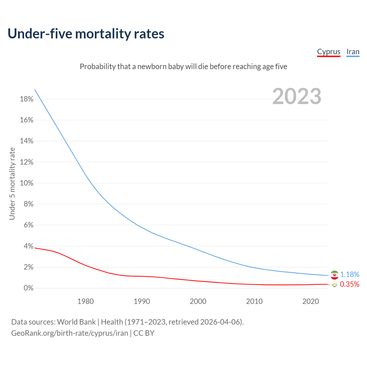 The chance that a newborn baby will die before reaching age five is 0.35% in Cyprus and 1.18% in Iran. Above is a chart with historical data on under-five mortality rates.