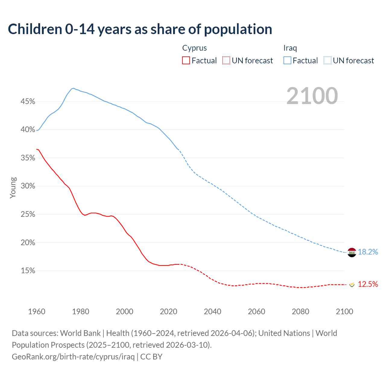 Cyprus has an annual birth rate of 10.8 births per 1,000 people, compared to 25.7 for Iraq. The average number of children a woman is expected to have during her lifetime — the fertility rate, is 1.39 in Cyprus and 3.25 in Iraq — 133.9% difference.