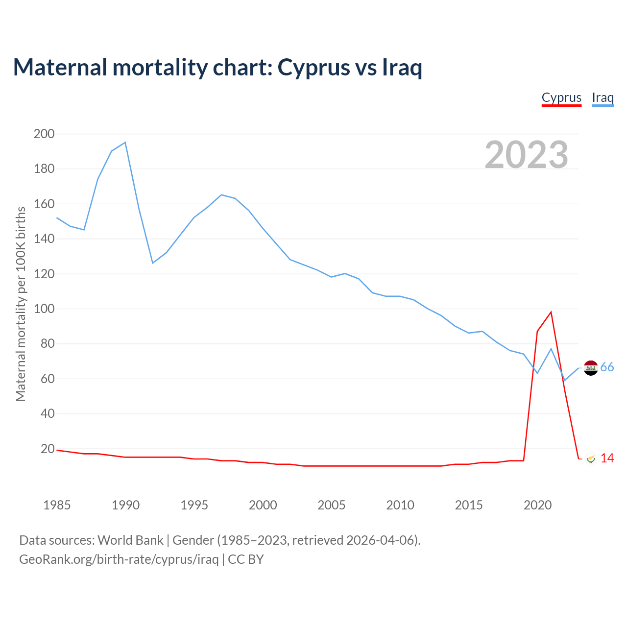 The maternal mortality rate, which is the probability of dying during childbirth or within 42 days of pregnancy termination, is 14 deaths per 100,000 live births in Cyprus, compared to 66 deaths in Iraq.