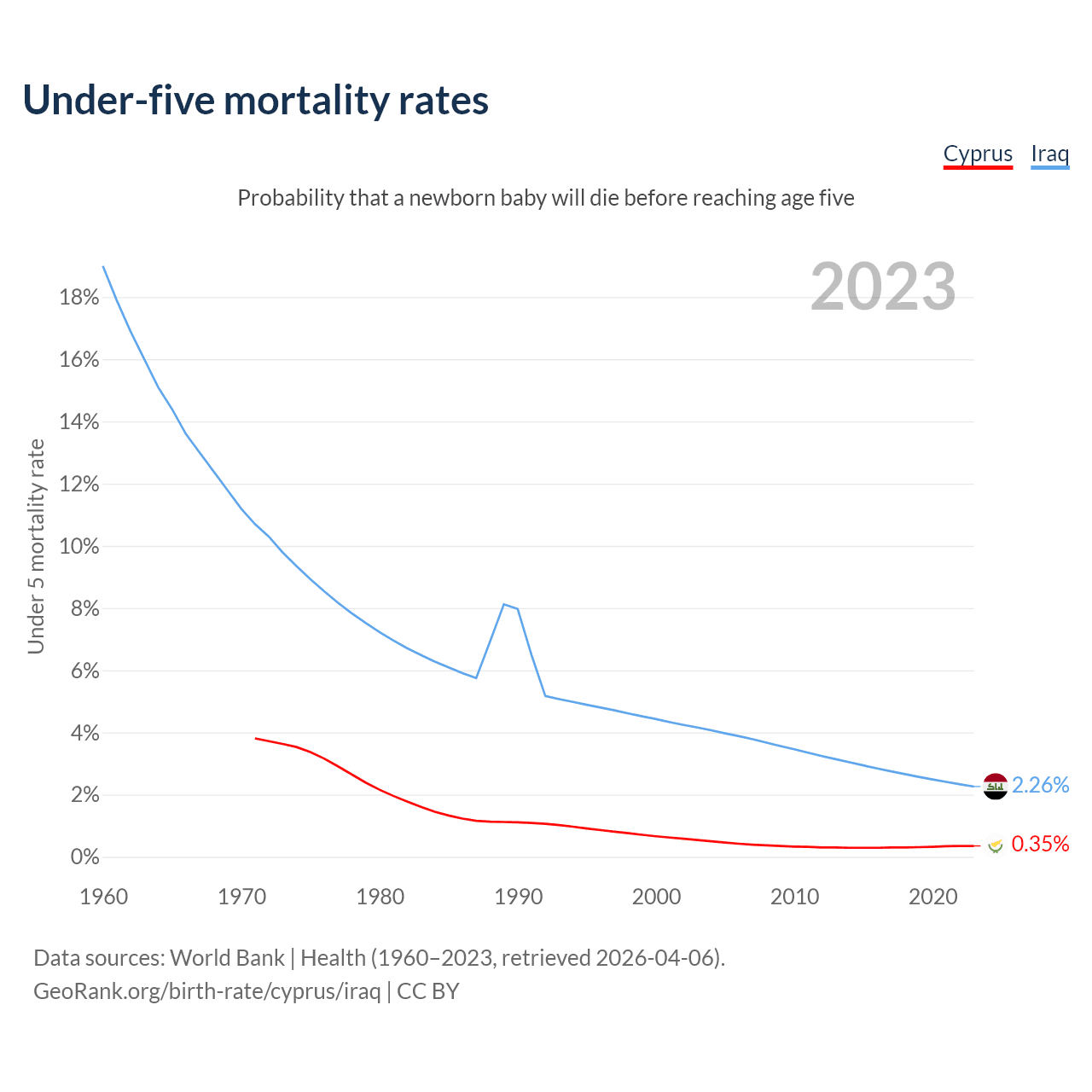 The chance that a newborn baby will die before reaching age five is 0.35% in Cyprus and 2.26% in Iraq. Above is a chart with historical data on under-five mortality rates.