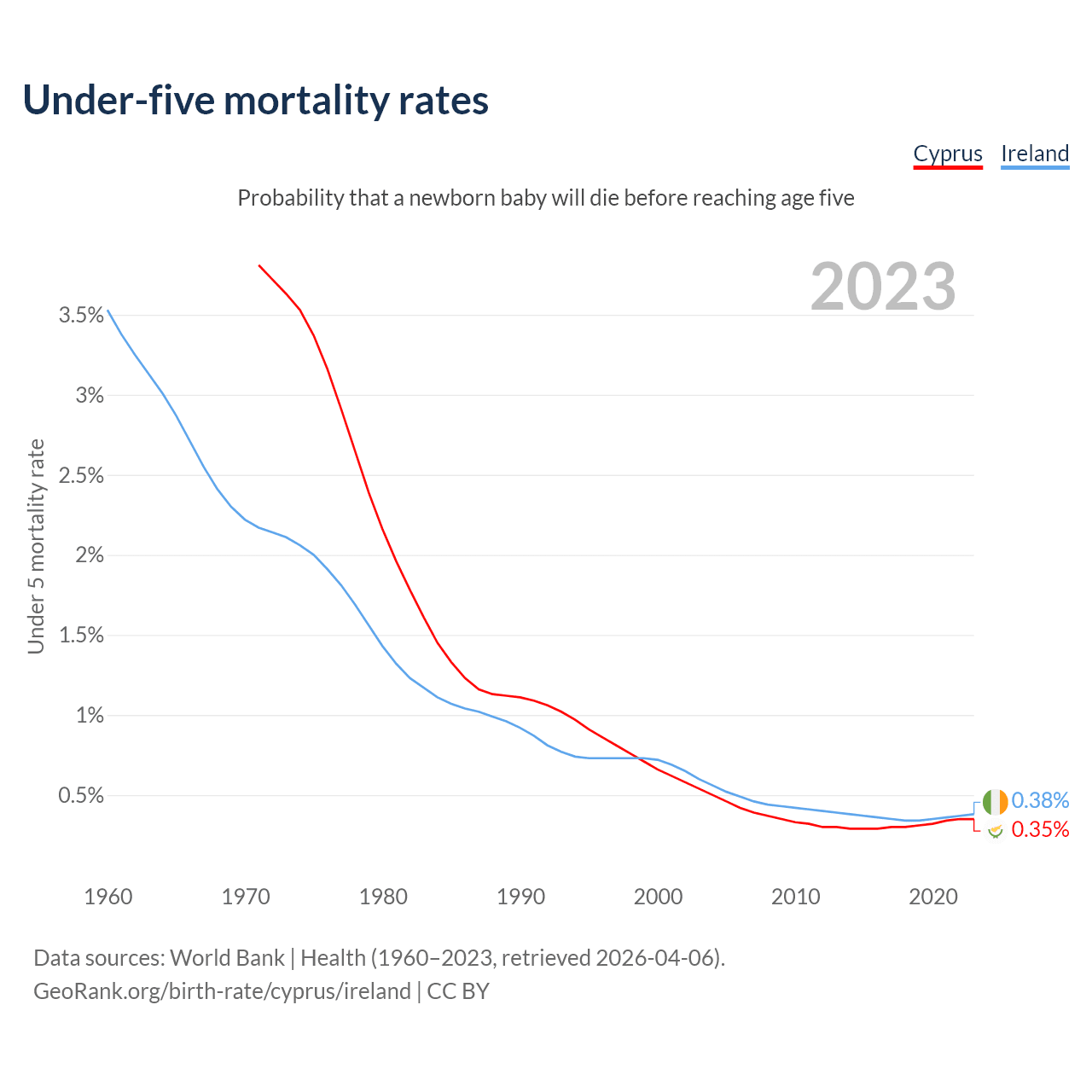 The chance that a newborn baby will die before reaching age five is 0.35% in Cyprus and 0.38% in Ireland. Above is a chart with historical data on under-five mortality rates.
