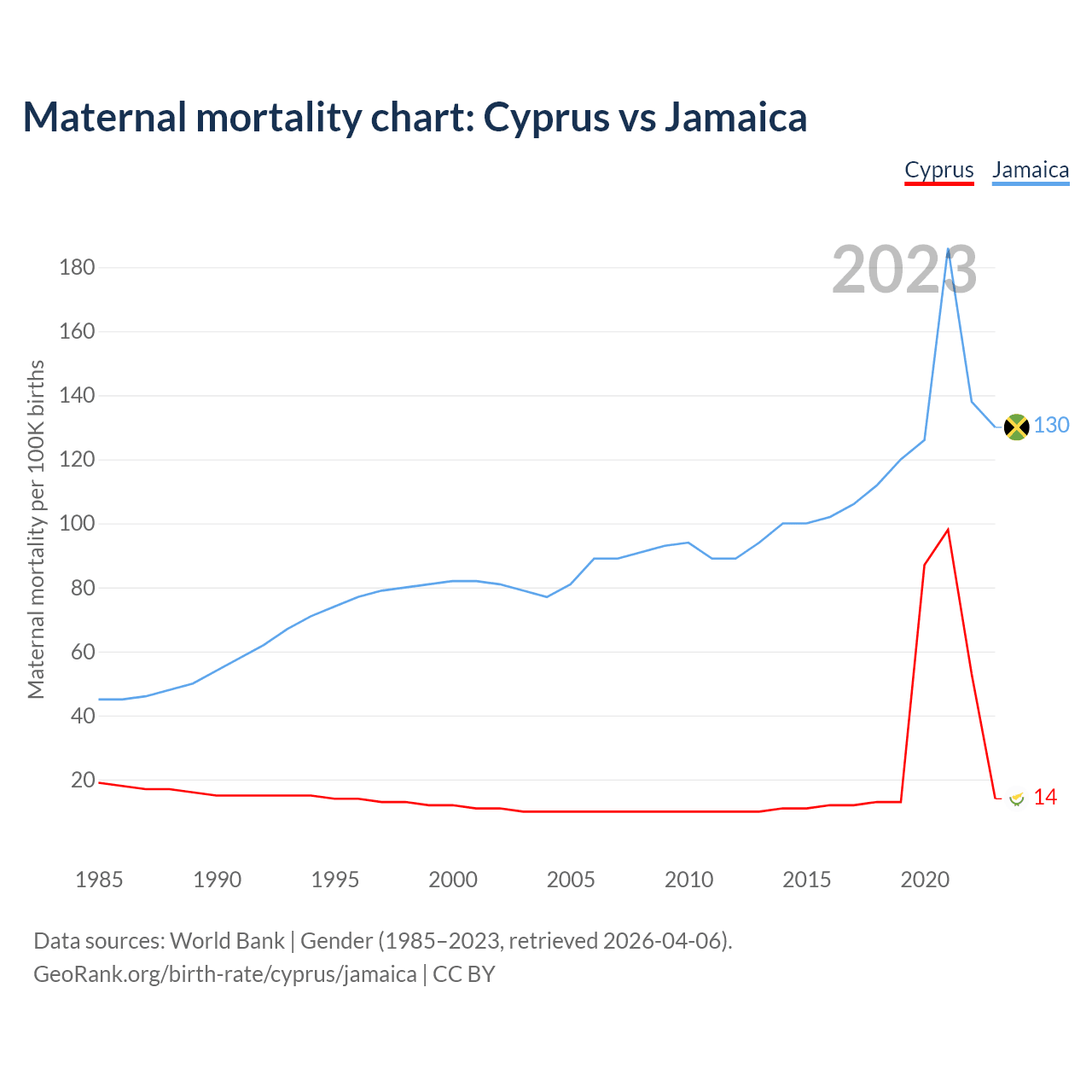 The maternal mortality rate, which is the probability of dying during childbirth or within 42 days of pregnancy termination, is 14 deaths per 100,000 live births in Cyprus, compared to 130 deaths in Jamaica.