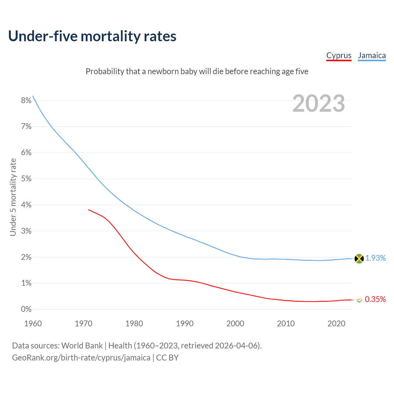 The chance that a newborn baby will die before reaching age five is 0.35% in Cyprus and 1.93% in Jamaica. Above is a chart with historical data on under-five mortality rates.
