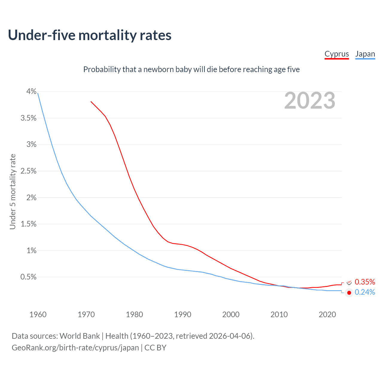 The chance that a newborn baby will die before reaching age five is 0.35% in Cyprus and 0.24% in Japan. Above is a chart with historical data on under-five mortality rates.