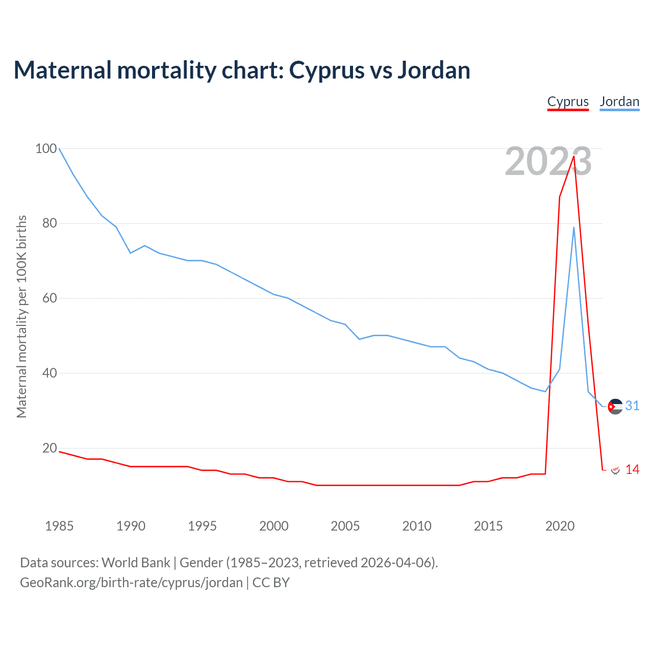 The maternal mortality rate, which is the probability of dying during childbirth or within 42 days of pregnancy termination, is 14 deaths per 100,000 live births in Cyprus, compared to 31 deaths in Jordan.