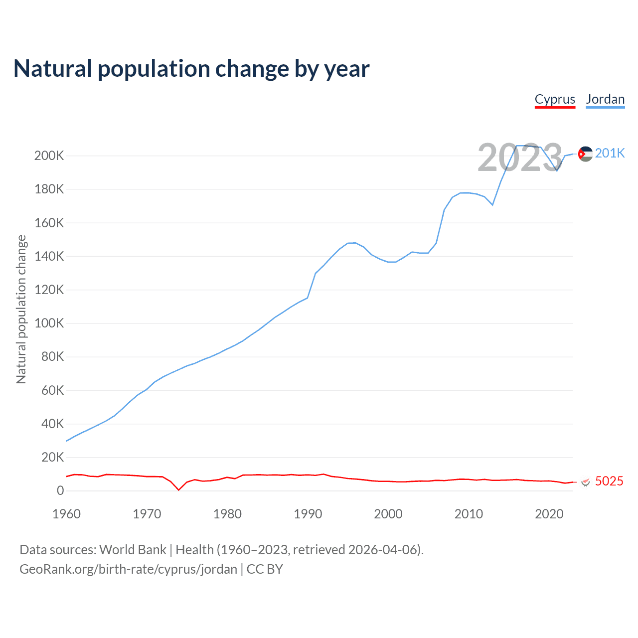 Cyprus has an annual birth rate of 10.8 births per 1,000 people, compared to 20.6 for Jordan. The average number of children a woman is expected to have during her lifetime — the fertility rate, is 1.39 in Cyprus and 2.64 in Jordan — 90% difference.
