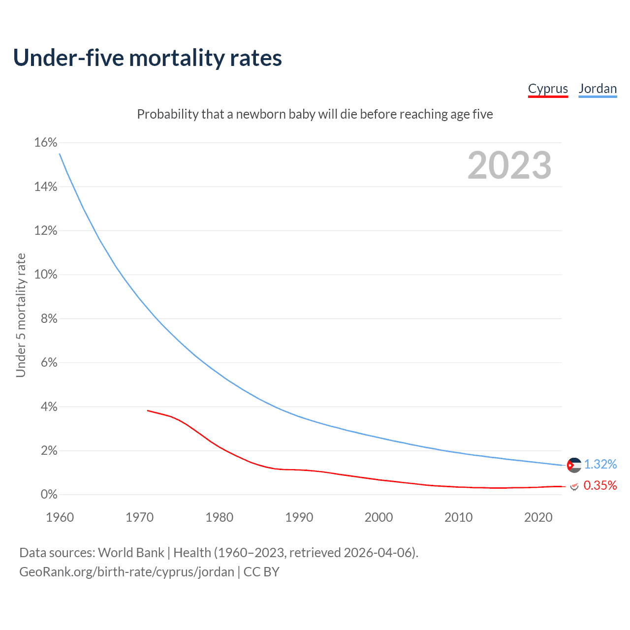 The chance that a newborn baby will die before reaching age five is 0.35% in Cyprus and 1.32% in Jordan. Above is a chart with historical data on under-five mortality rates.