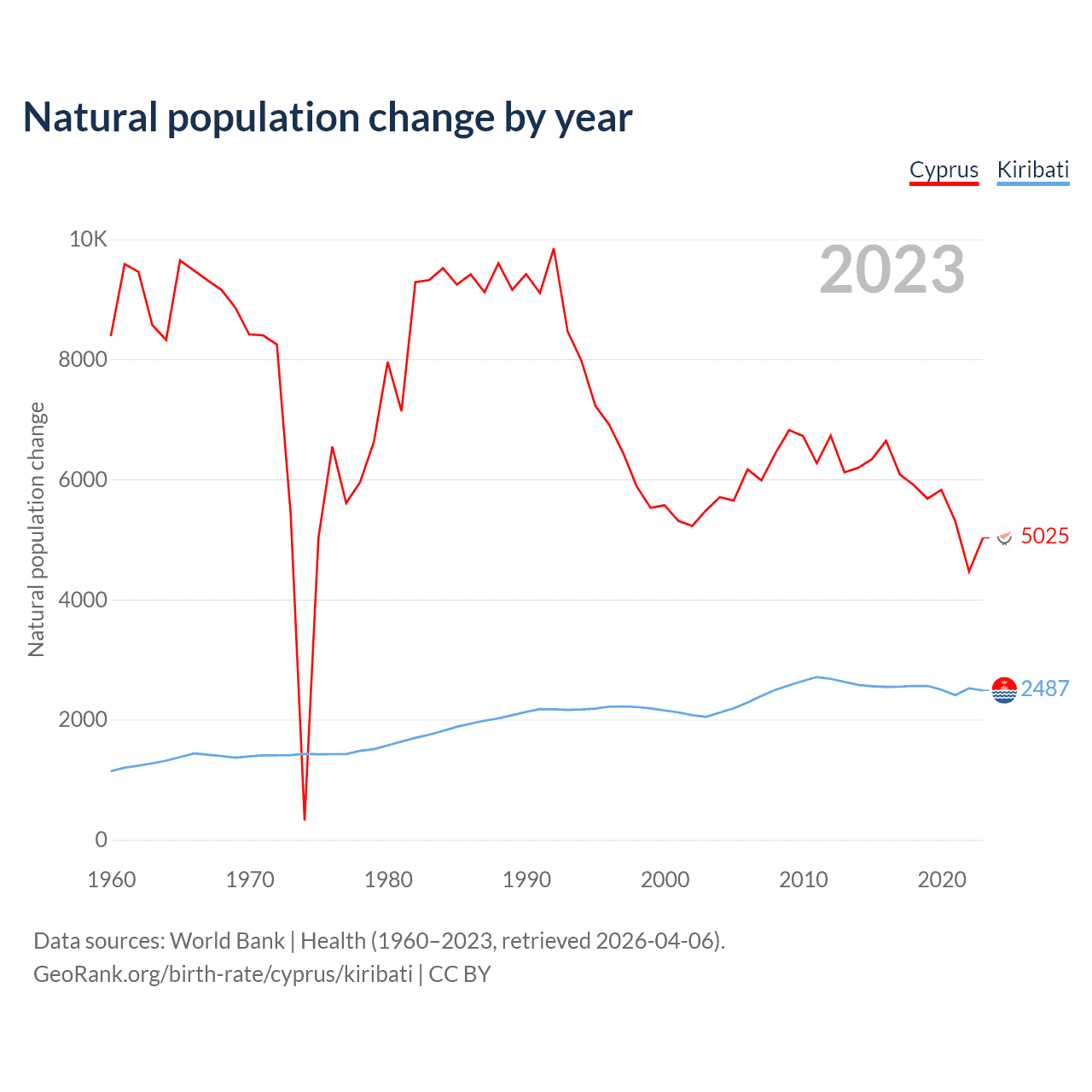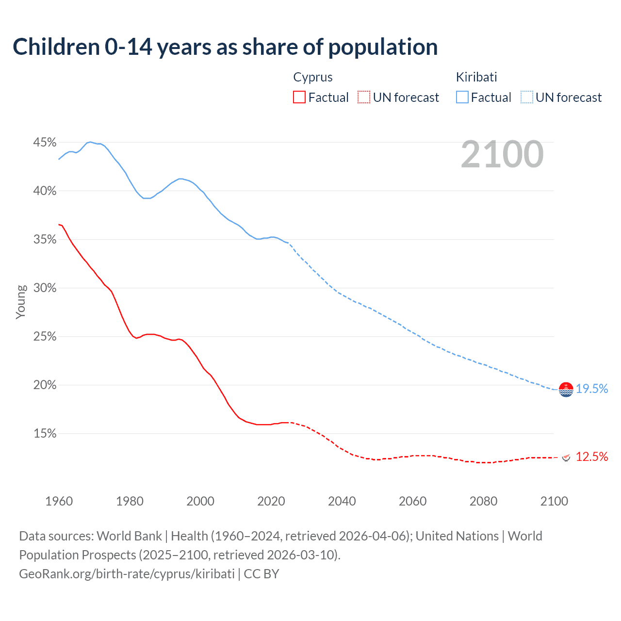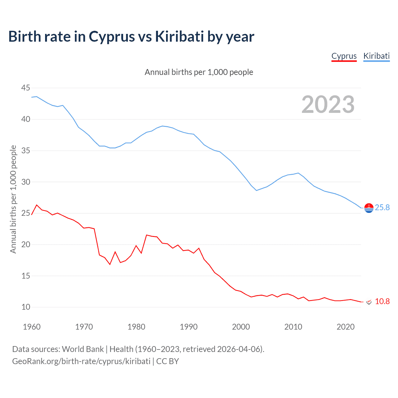 Cyprus has an annual birth rate of 10.8 births per 1,000 people, compared to 25.8 for Kiribati. The average number of children a woman is expected to have during her lifetime — the fertility rate, is 1.39 in Cyprus and 3.15 in Kiribati — 126.6% difference.