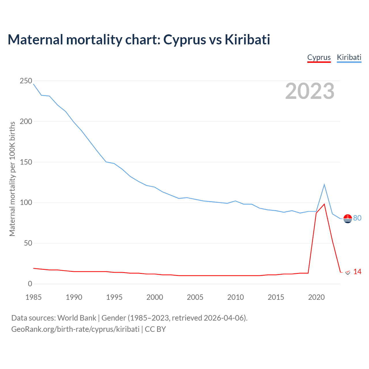 The maternal mortality rate, which is the probability of dying during childbirth or within 42 days of pregnancy termination, is 14 deaths per 100,000 live births in Cyprus, compared to 80 deaths in Kiribati.