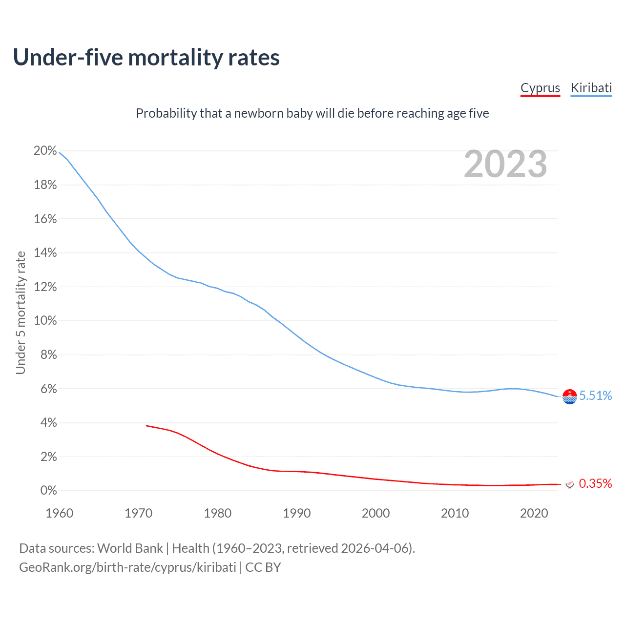 The chance that a newborn baby will die before reaching age five is 0.35% in Cyprus and 5.51% in Kiribati. Above is a chart with historical data on under-five mortality rates.