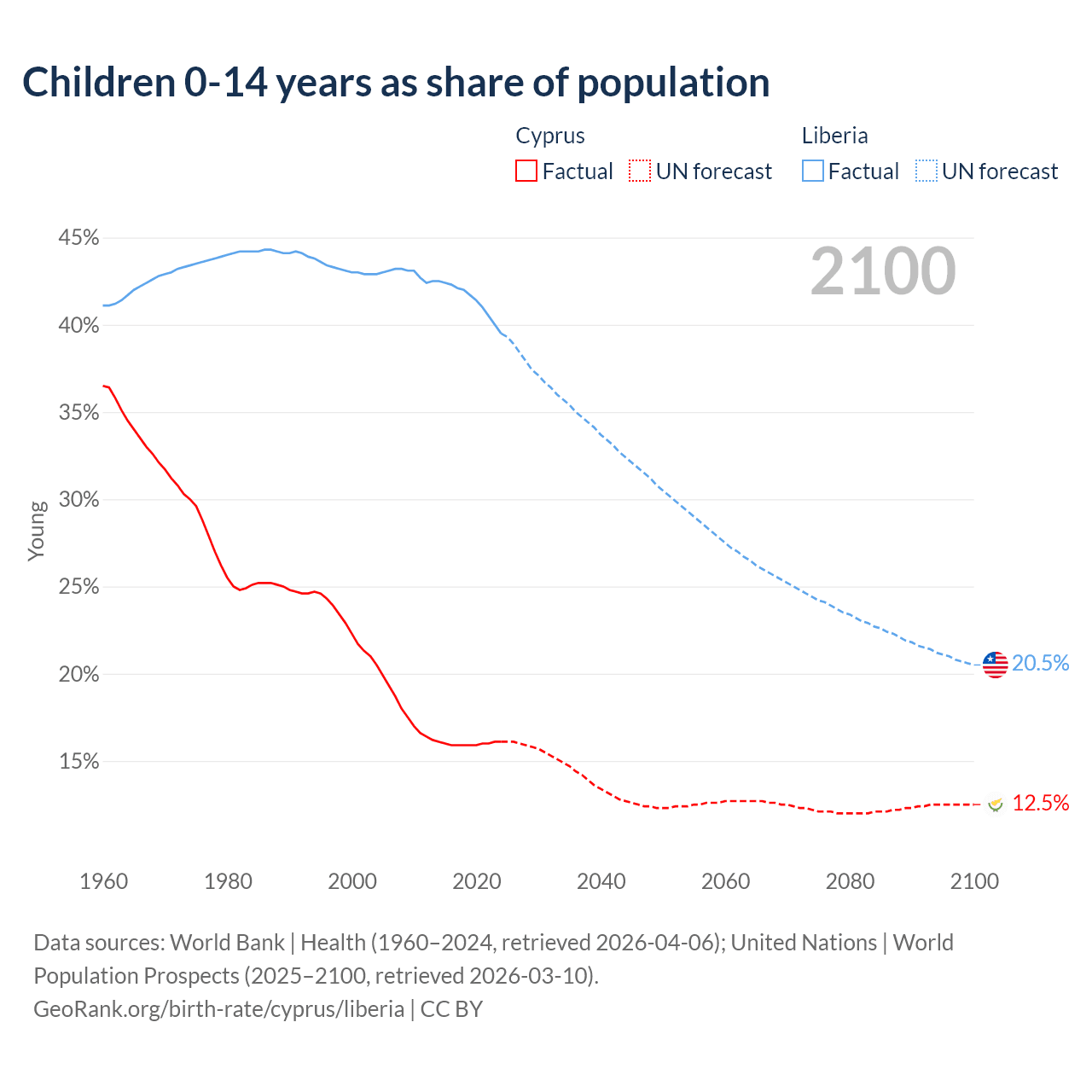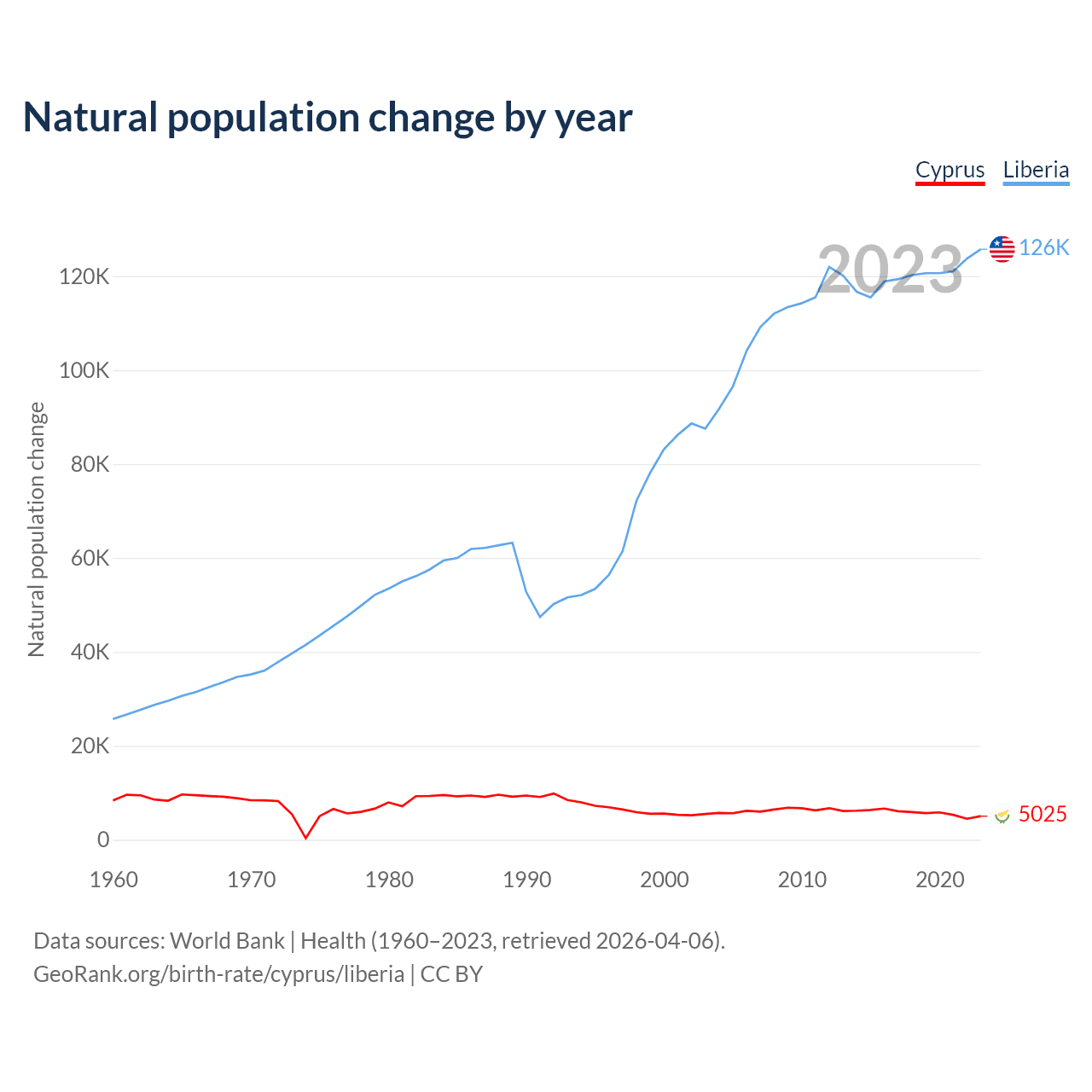 Cyprus has an annual birth rate of 10.8 births per 1,000 people, compared to 31 for Liberia. The average number of children a woman is expected to have during her lifetime — the fertility rate, is 1.39 in Cyprus and 3.95 in Liberia — 184.4% difference.