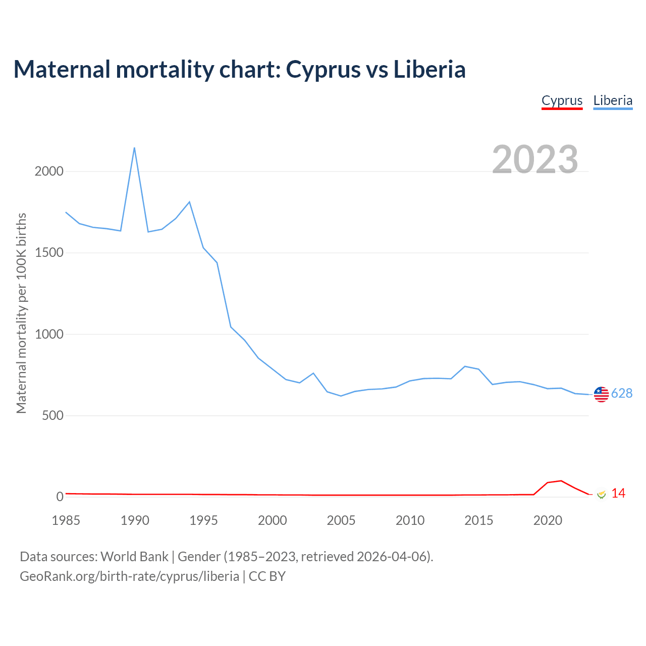 The maternal mortality rate, which is the probability of dying during childbirth or within 42 days of pregnancy termination, is 14 deaths per 100,000 live births in Cyprus, compared to 628 deaths in Liberia.