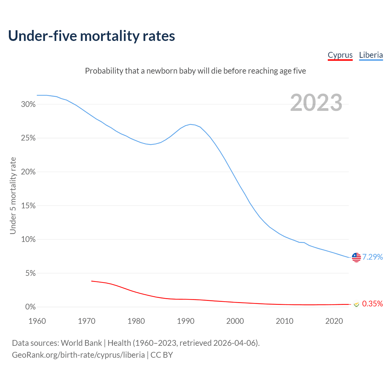 The chance that a newborn baby will die before reaching age five is 0.35% in Cyprus and 7.29% in Liberia. Above is a chart with historical data on under-five mortality rates.