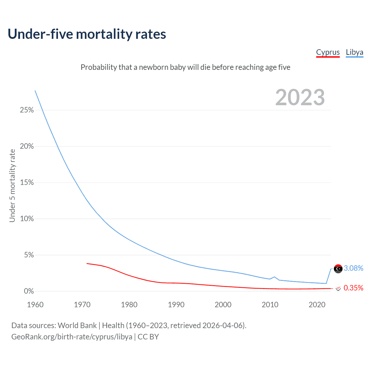 The chance that a newborn baby will die before reaching age five is 0.35% in Cyprus and 3.08% in Libya. Above is a chart with historical data on under-five mortality rates.