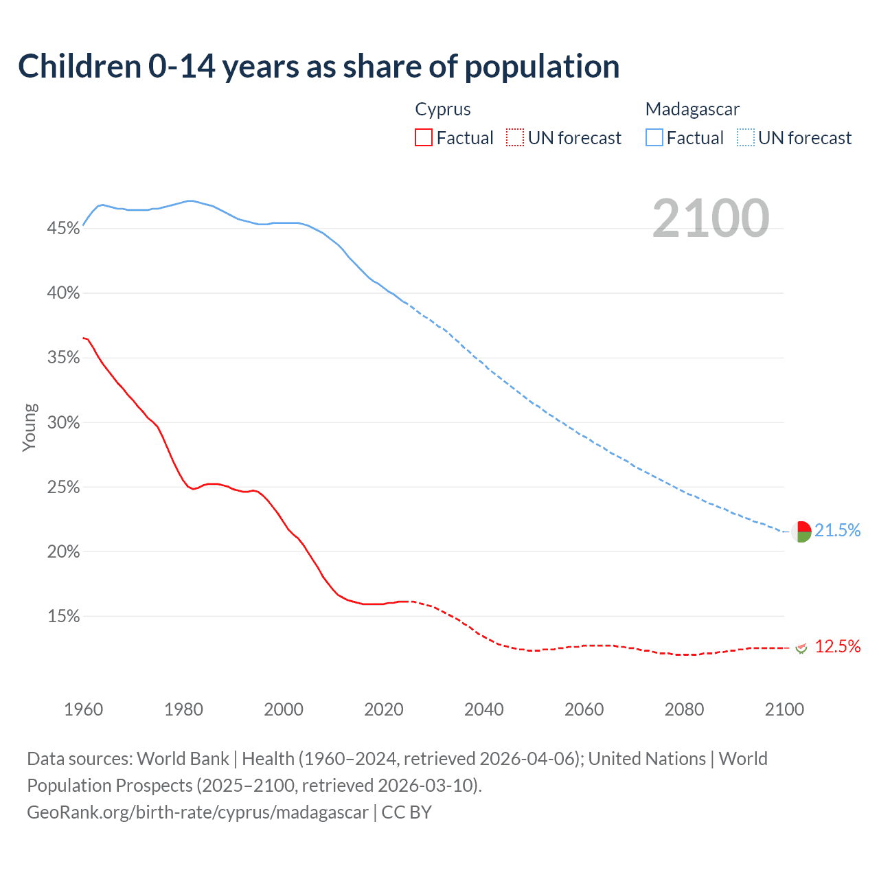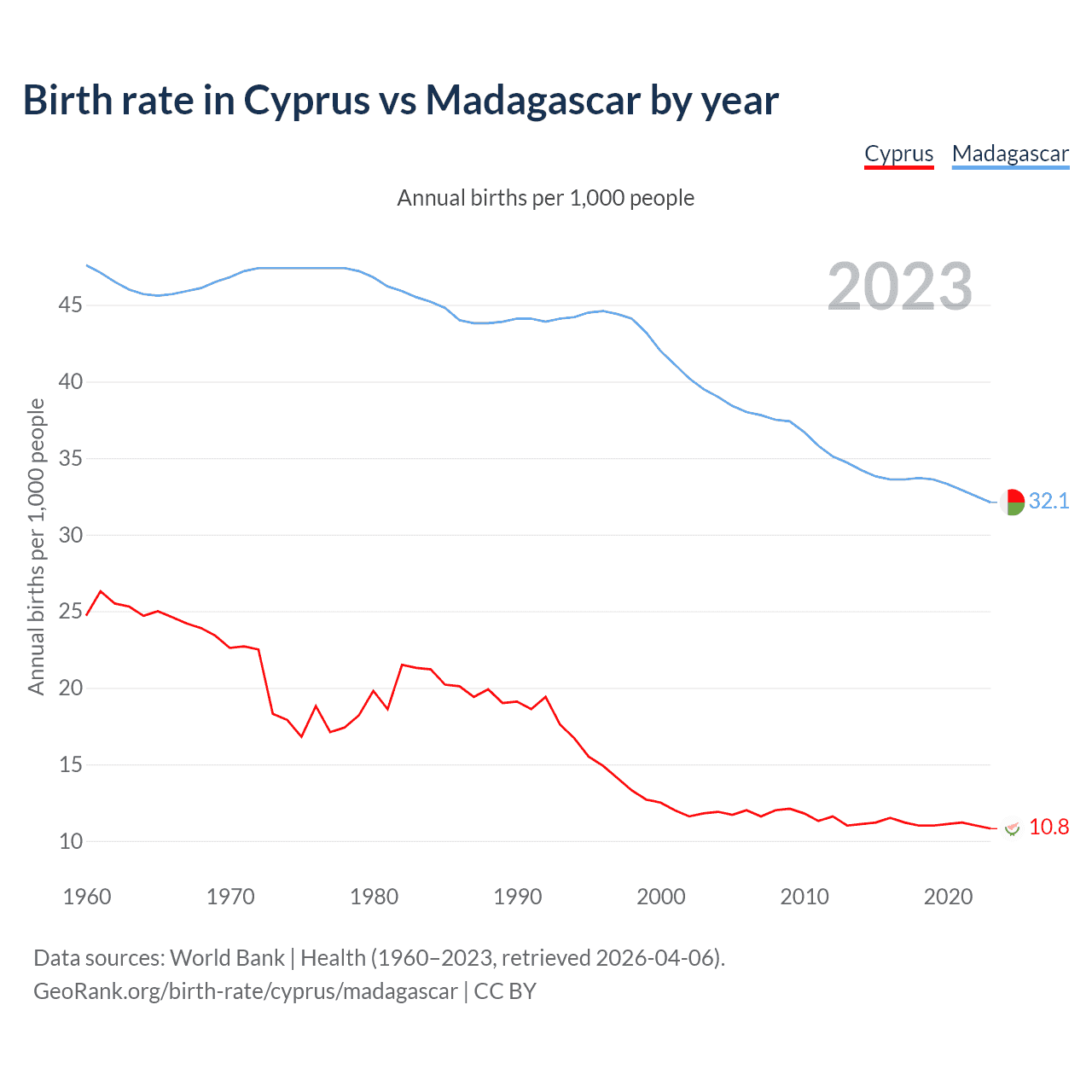 Cyprus has an annual birth rate of 10.8 births per 1,000 people, compared to 32.1 for Madagascar. The average number of children a woman is expected to have during her lifetime — the fertility rate, is 1.39 in Cyprus and 3.97 in Madagascar — 186% difference.