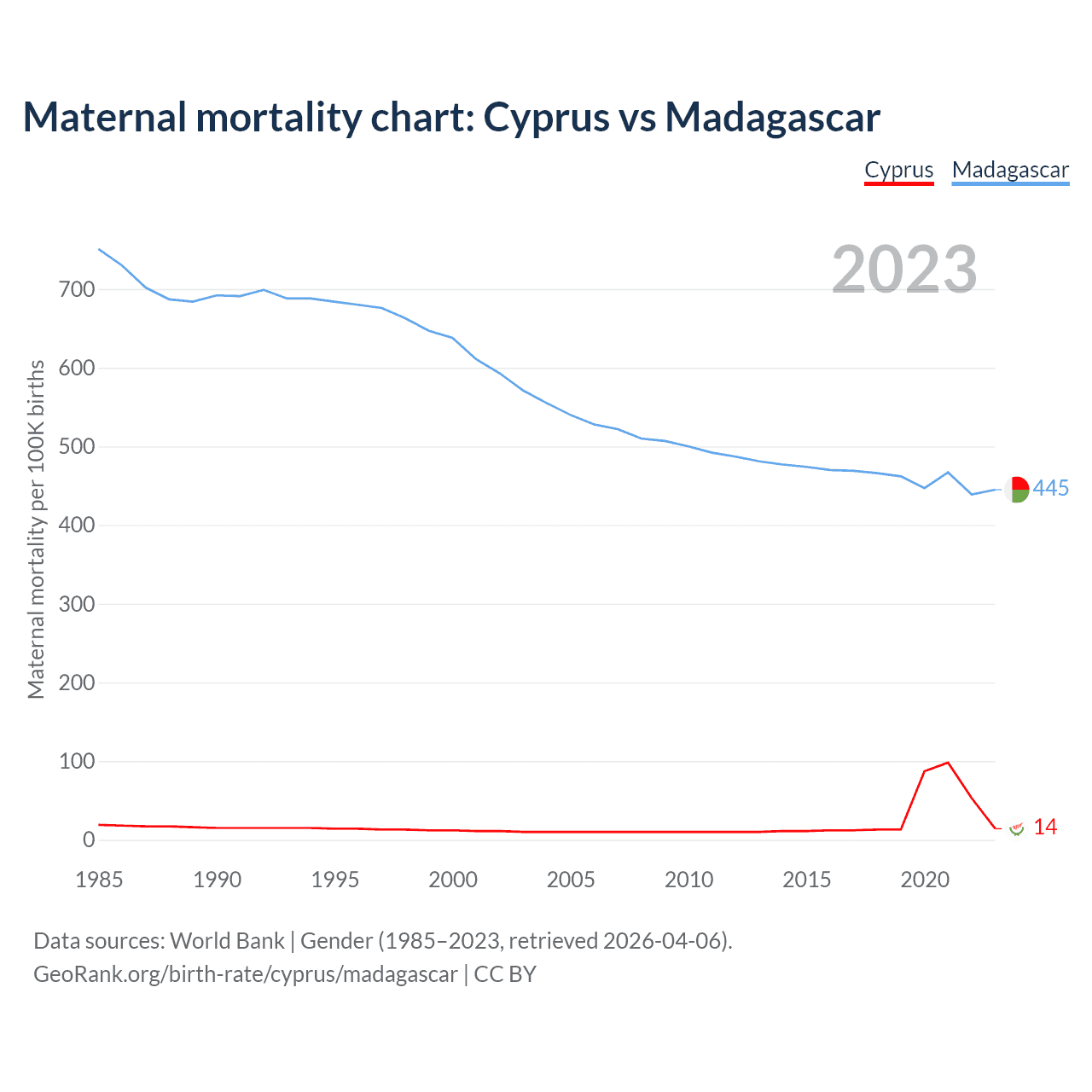 The maternal mortality rate, which is the probability of dying during childbirth or within 42 days of pregnancy termination, is 14 deaths per 100,000 live births in Cyprus, compared to 445 deaths in Madagascar.