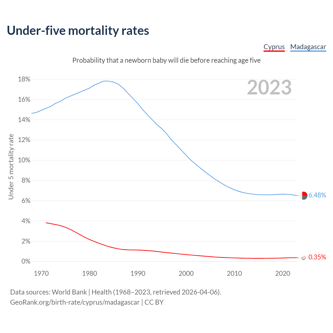 The chance that a newborn baby will die before reaching age five is 0.35% in Cyprus and 6.48% in Madagascar. Above is a chart with historical data on under-five mortality rates.