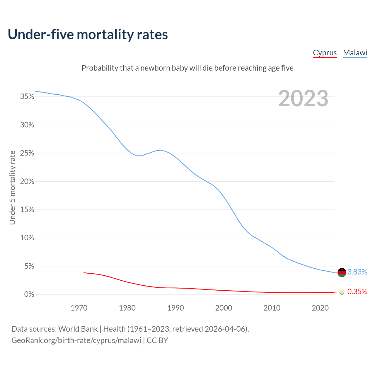 The chance that a newborn baby will die before reaching age five is 0.35% in Cyprus and 3.83% in Malawi. Above is a chart with historical data on under-five mortality rates.