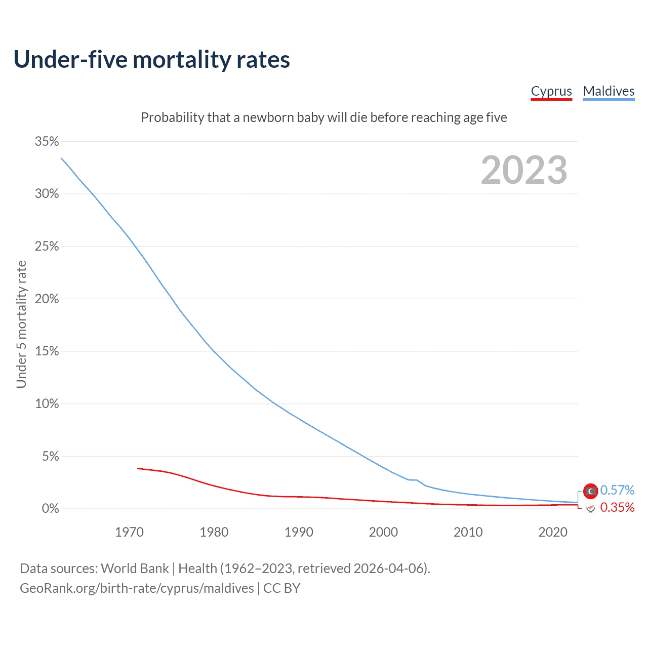 The chance that a newborn baby will die before reaching age five is 0.35% in Cyprus and 0.57% in Maldives. Above is a chart with historical data on under-five mortality rates.