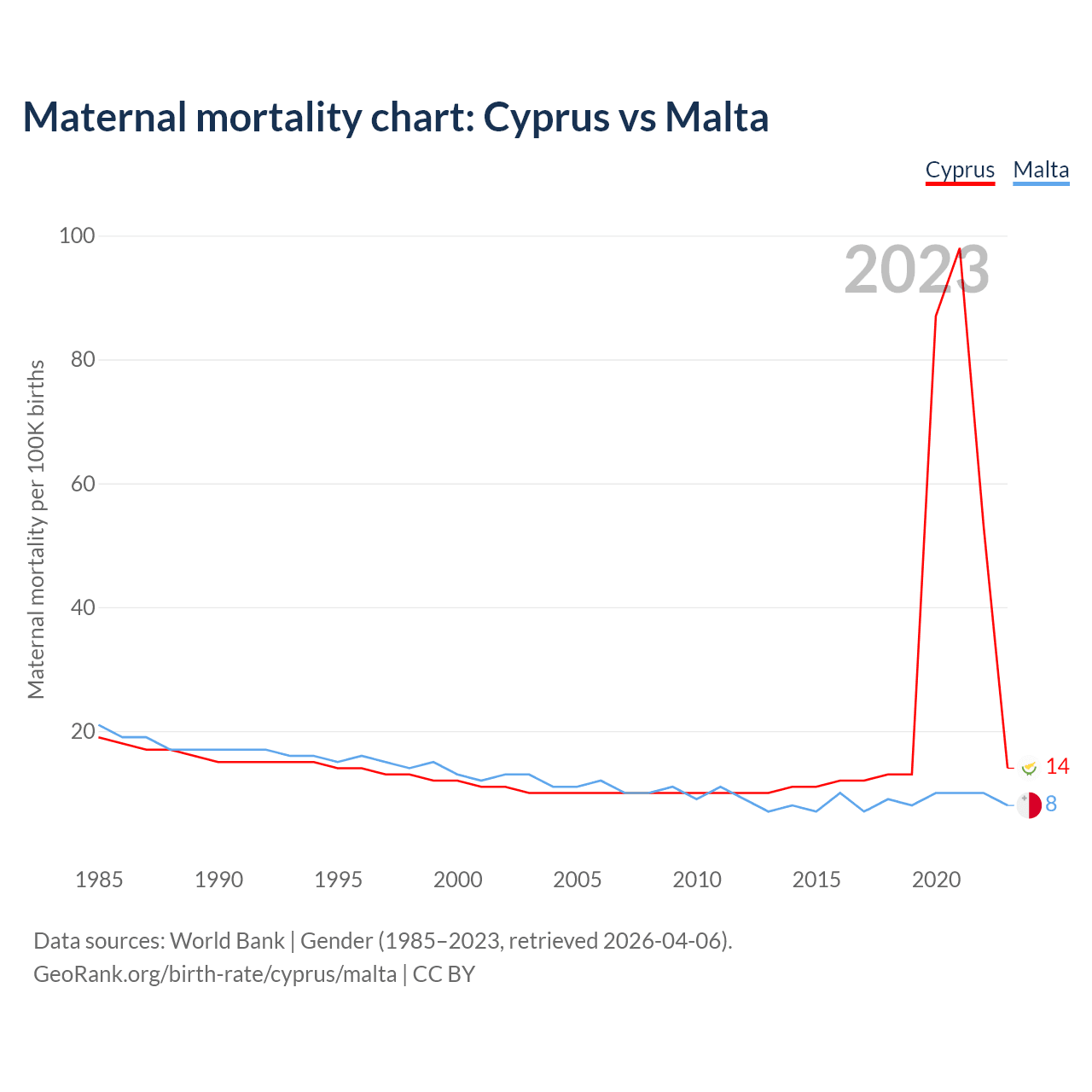 The maternal mortality rate, which is the probability of dying during childbirth or within 42 days of pregnancy termination, is 14 deaths per 100,000 live births in Cyprus, compared to 8 deaths in Malta.