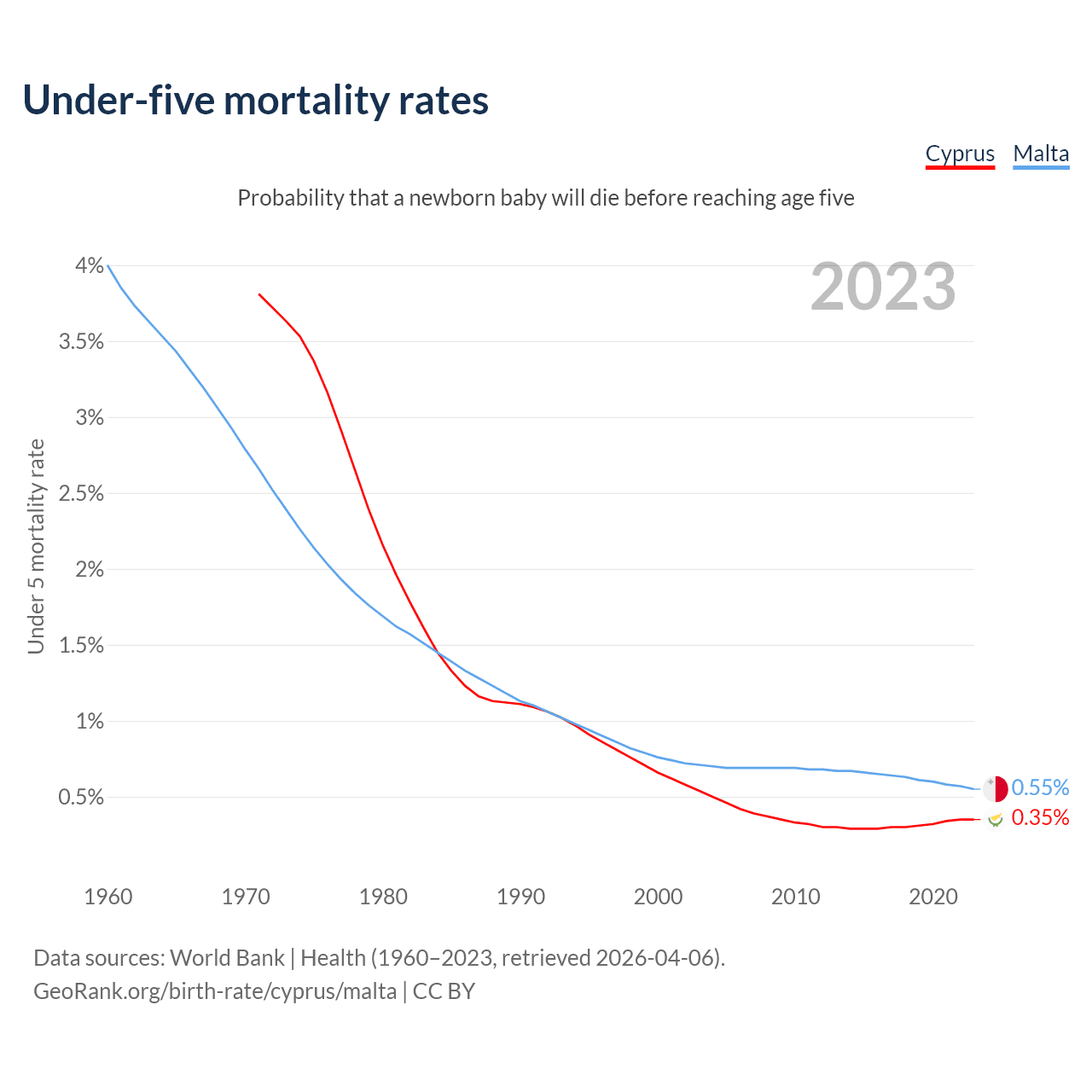 The chance that a newborn baby will die before reaching age five is 0.35% in Cyprus and 0.55% in Malta. Above is a chart with historical data on under-five mortality rates.