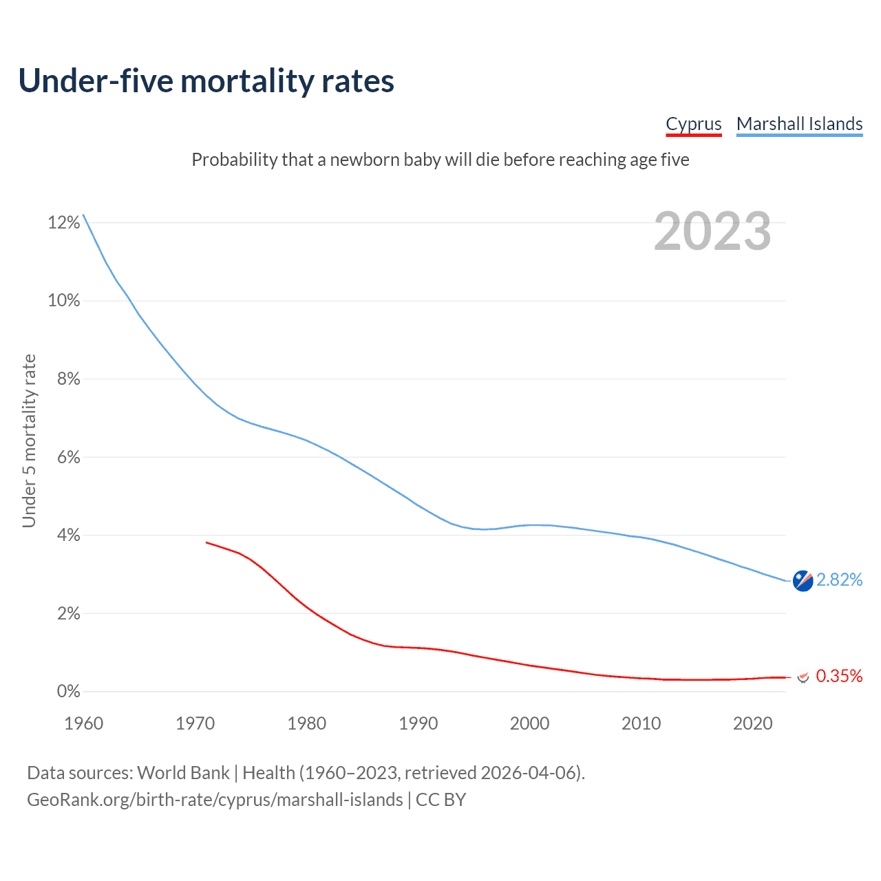 The chance that a newborn baby will die before reaching age five is 0.35% in Cyprus and 2.82% in the Marshall Islands. Above is a chart with historical data on under-five mortality rates.