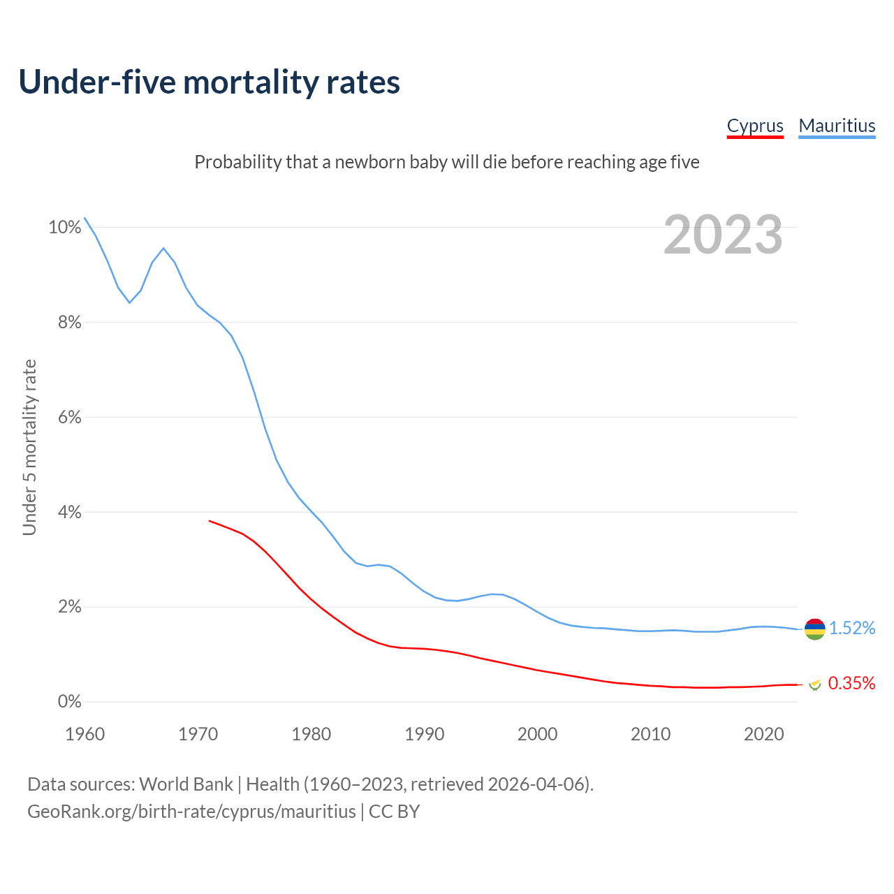 The chance that a newborn baby will die before reaching age five is 0.35% in Cyprus and 1.52% in Mauritius. Above is a chart with historical data on under-five mortality rates.