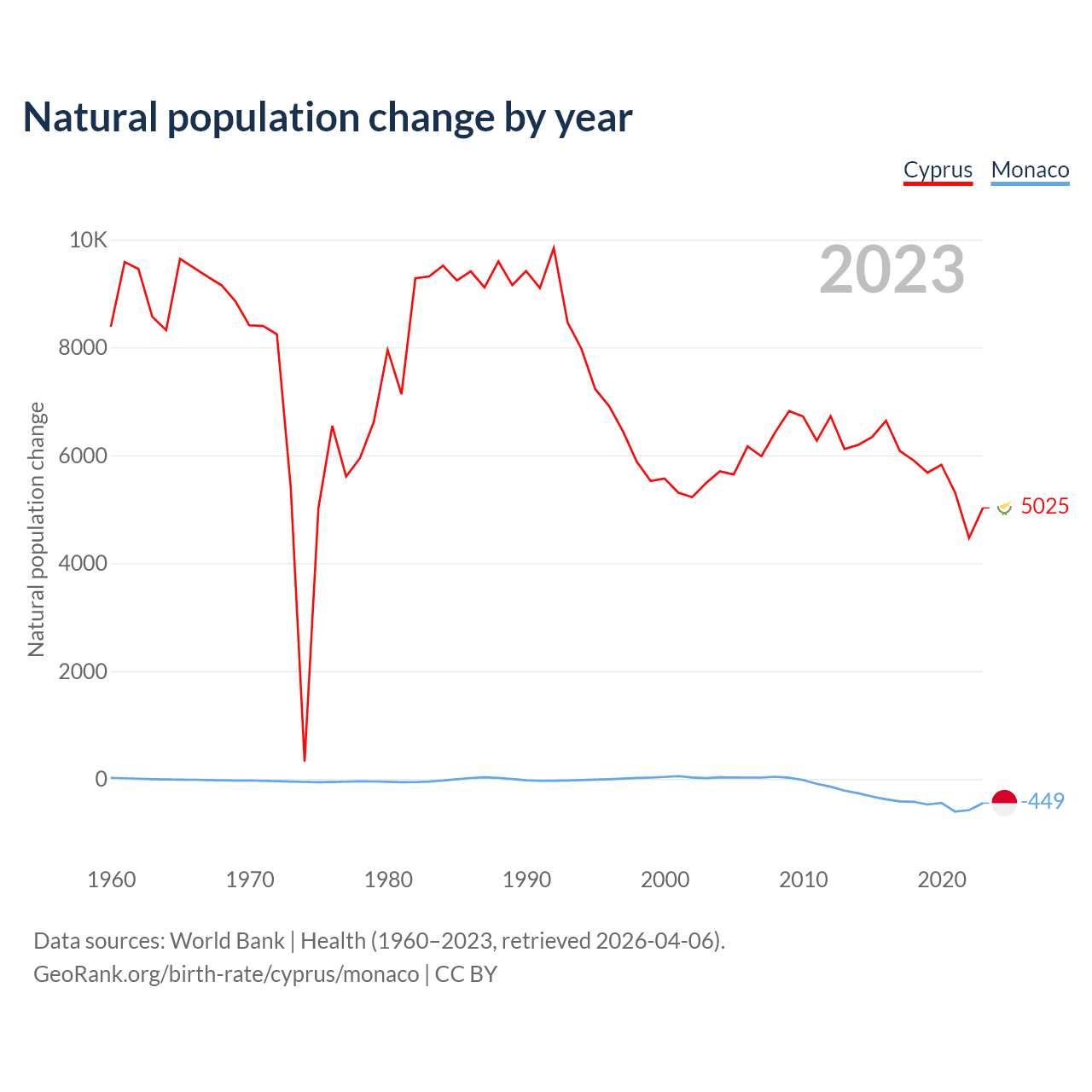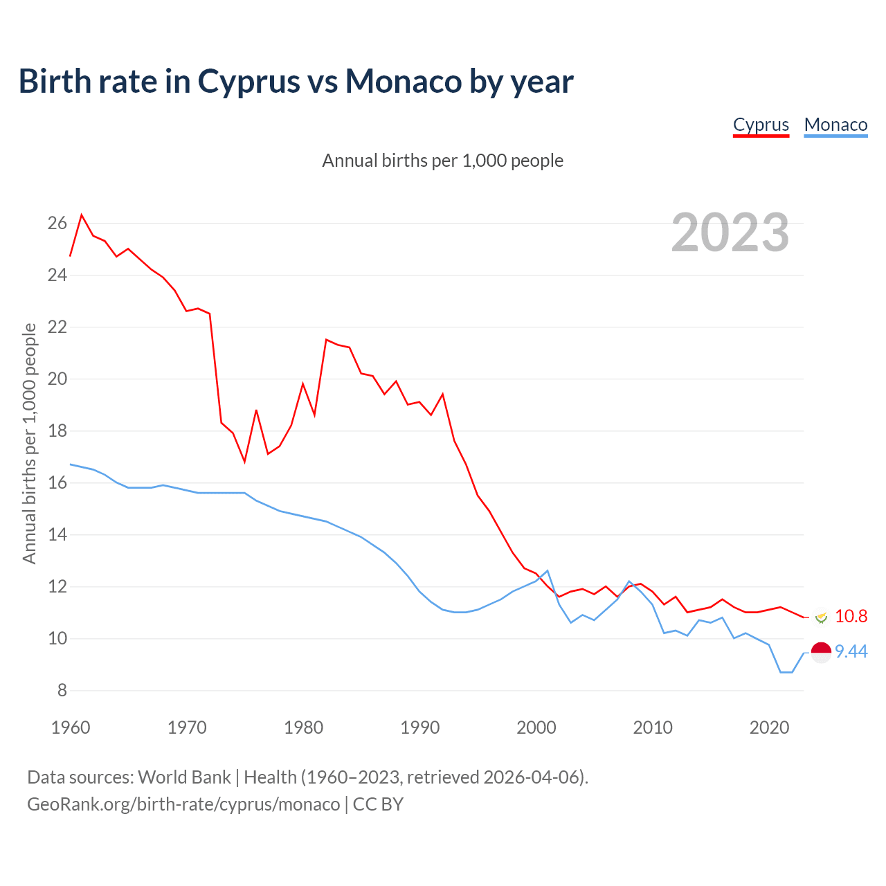 Cyprus has an annual birth rate of 10.8 births per 1,000 people, compared to 9.44 for Monaco. The average number of children a woman is expected to have during her lifetime — the fertility rate, is 1.39 in Cyprus and 2.11 in Monaco — 51.9% difference.
