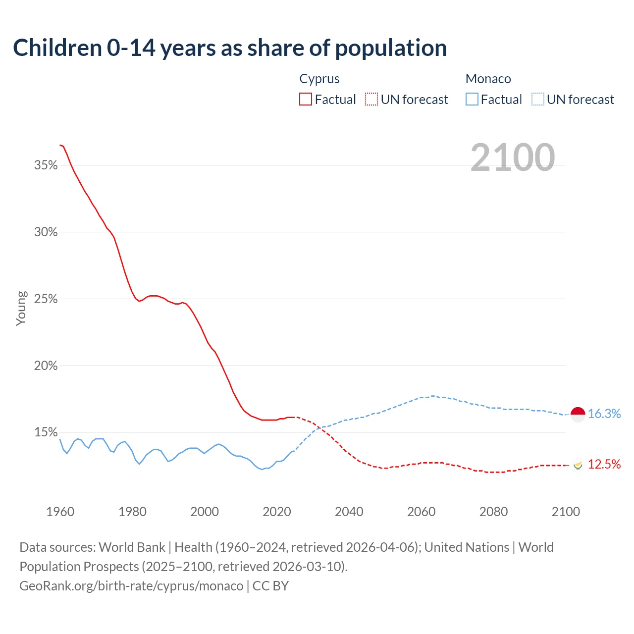 According to the latest available data on birth rates, the fertility rate in Cyprus was 1.39 children per woman in 2023, compared to 2.11 in Monaco in 2023. The replacement level is considered to be 2.1 children per woman.