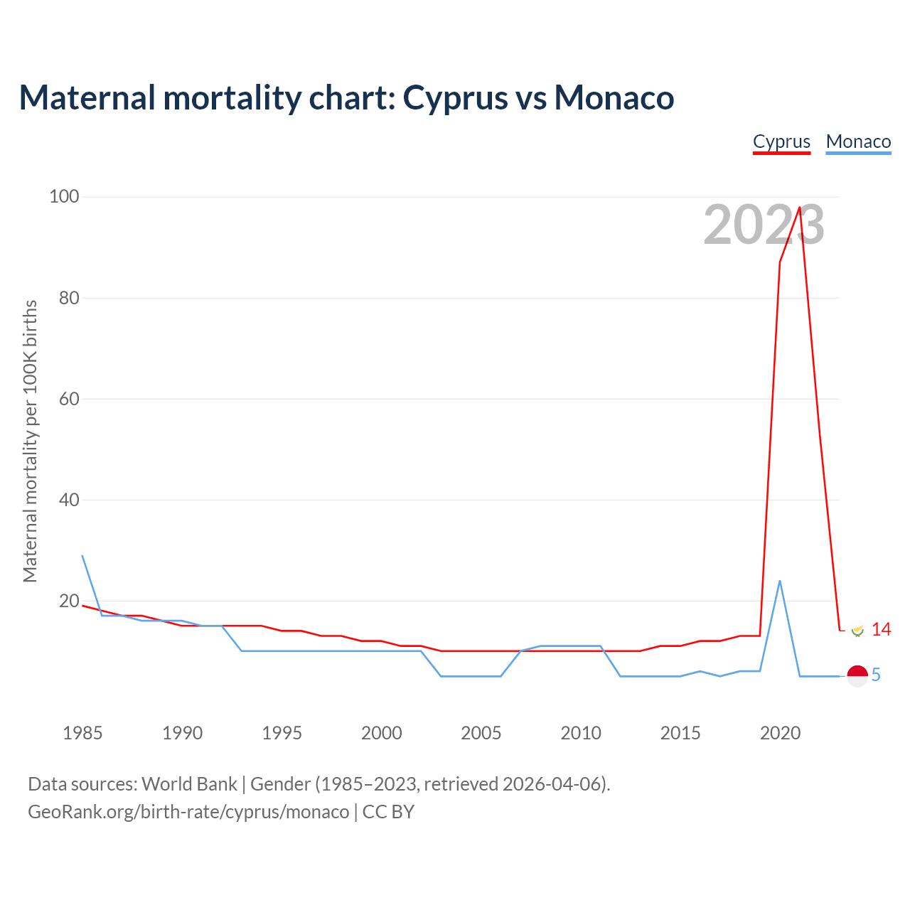 The maternal mortality rate, which is the probability of dying during childbirth or within 42 days of pregnancy termination, is 14 deaths per 100,000 live births in Cyprus, compared to 5 deaths in Monaco.