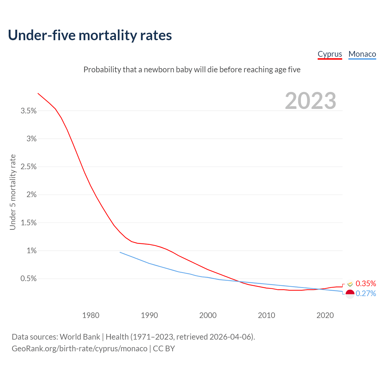 The chance that a newborn baby will die before reaching age five is 0.35% in Cyprus and 0.27% in Monaco. Above is a chart with historical data on under-five mortality rates.