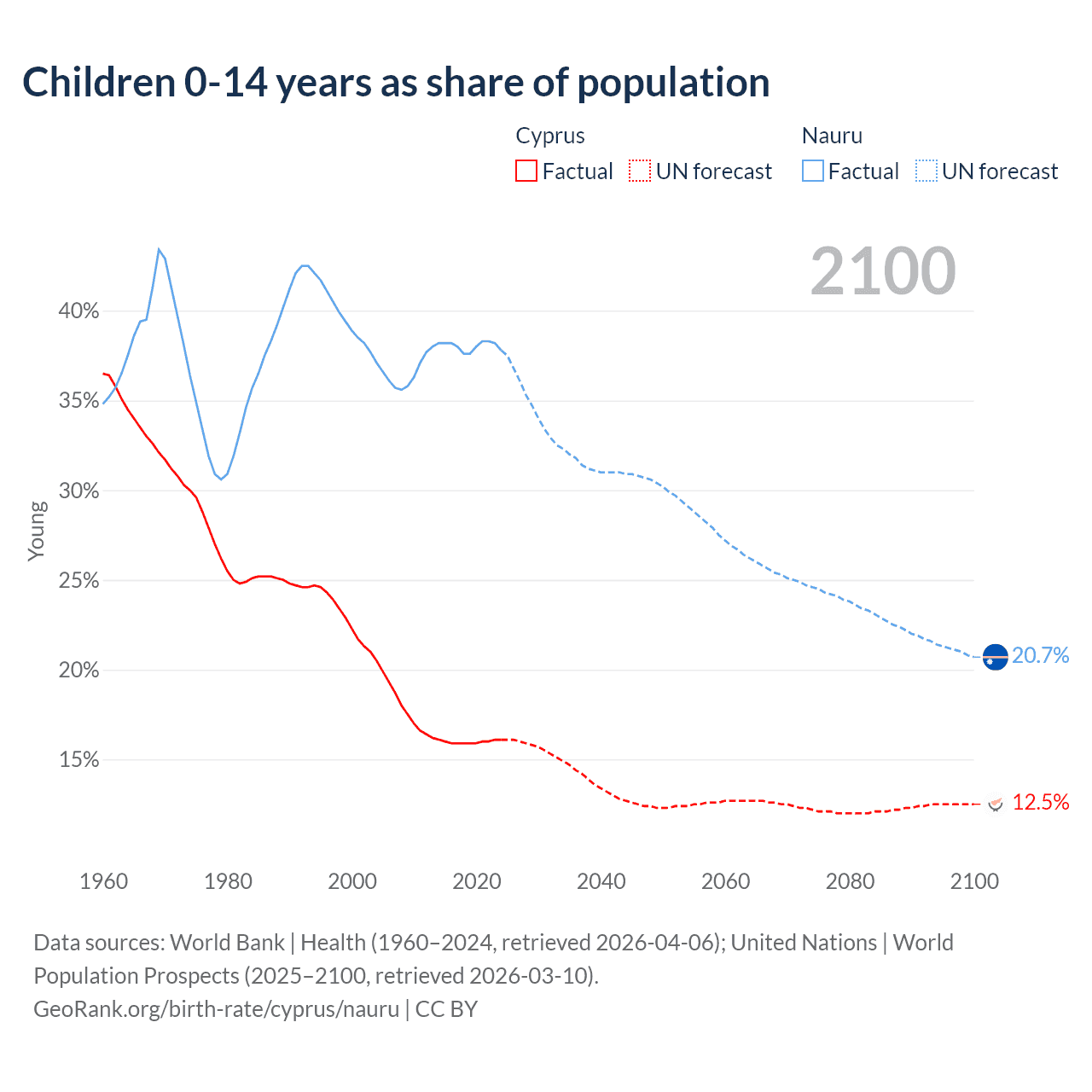 Cyprus has an annual birth rate of 10.8 births per 1,000 people, compared to 25.5 for Nauru. The average number of children a woman is expected to have during her lifetime — the fertility rate, is 1.39 in Cyprus and 3.33 in Nauru — 139.8% difference.