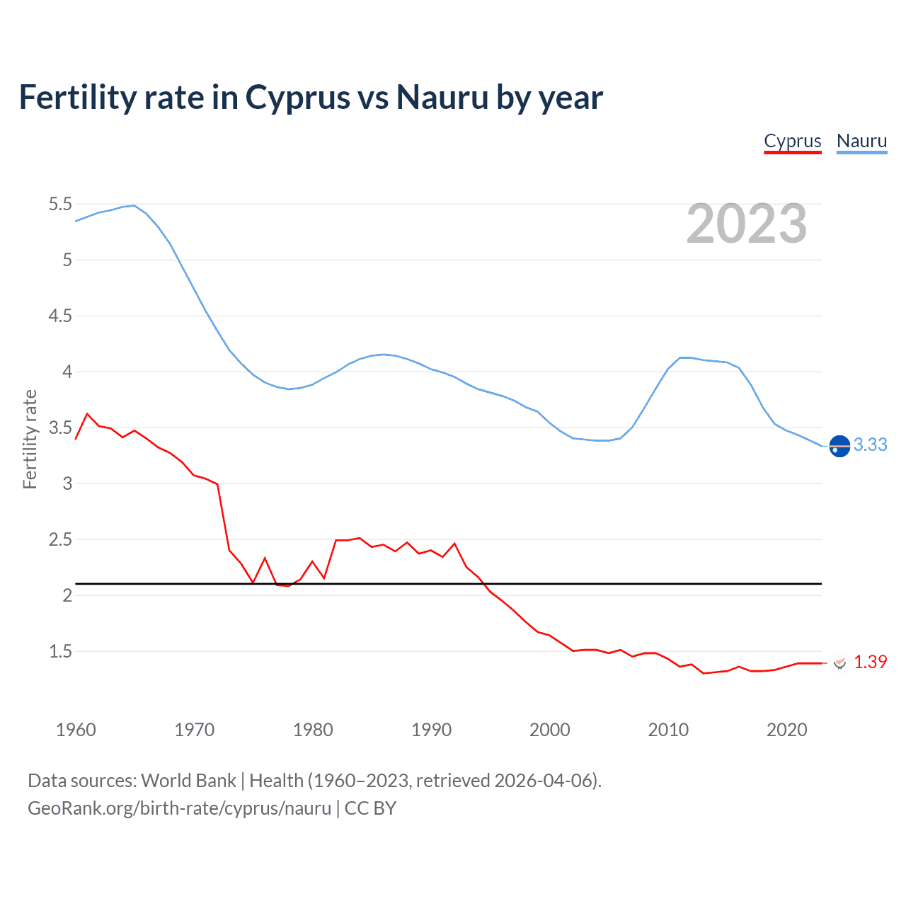 According to the latest available data on birth rates, the fertility rate in Cyprus was 1.39 children per woman in 2023, compared to 3.33 in Nauru in 2023. The replacement level is considered to be 2.1 children per woman.