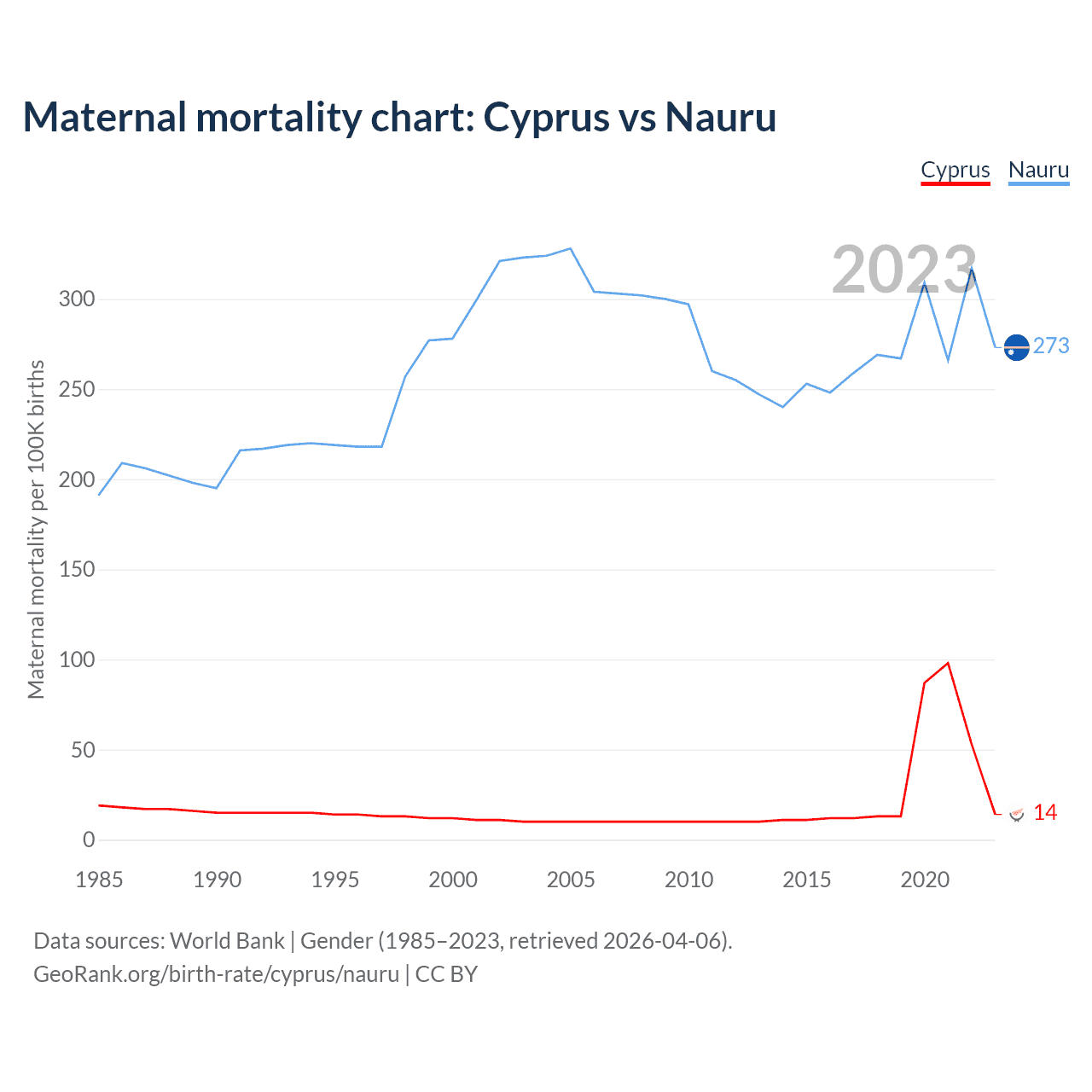 The maternal mortality rate, which is the probability of dying during childbirth or within 42 days of pregnancy termination, is 14 deaths per 100,000 live births in Cyprus, compared to 273 deaths in Nauru.