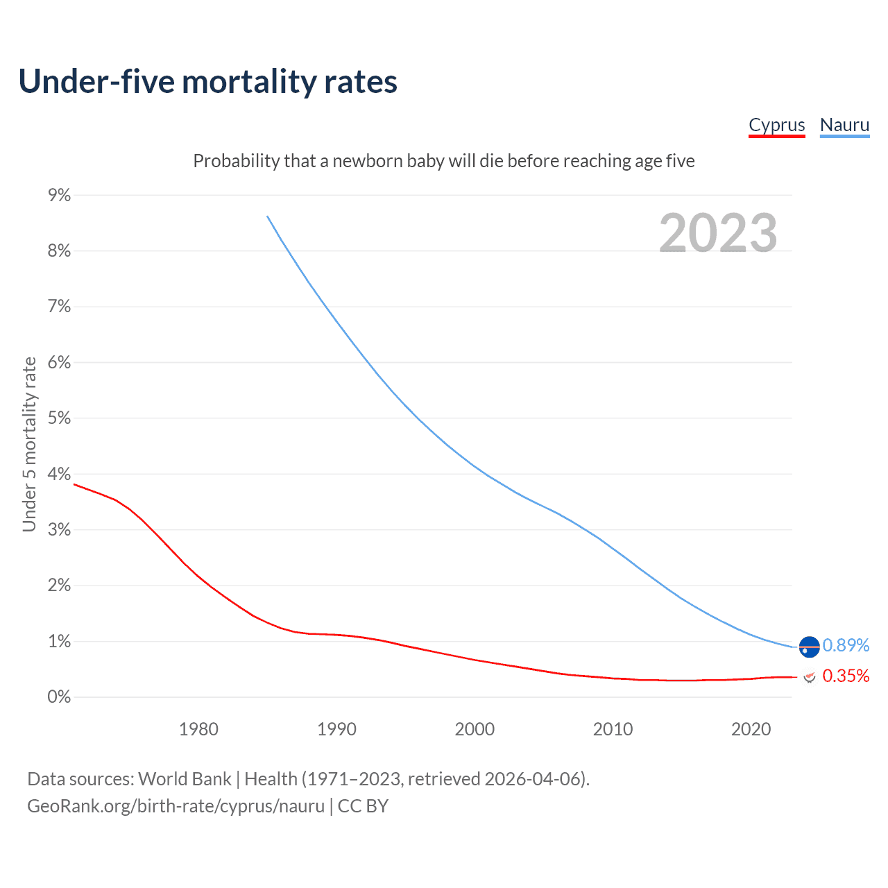The chance that a newborn baby will die before reaching age five is 0.35% in Cyprus and 0.89% in Nauru. Above is a chart with historical data on under-five mortality rates.