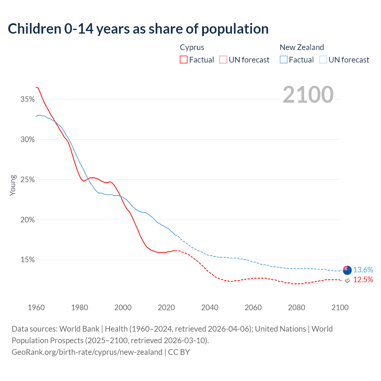 According to the latest available data on birth rates, the fertility rate in Cyprus was 1.39 children per woman in 2023, compared to 1.56 in New Zealand in 2023. The replacement level is considered to be 2.1 children per woman.