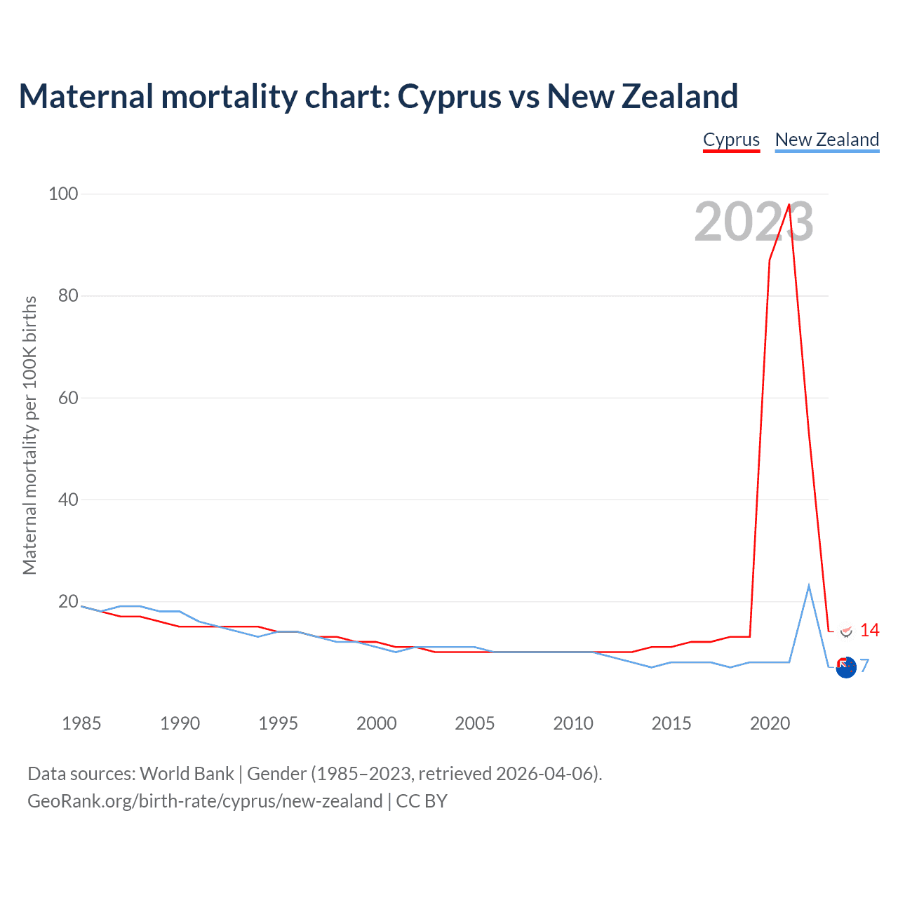 The maternal mortality rate, which is the probability of dying during childbirth or within 42 days of pregnancy termination, is 14 deaths per 100,000 live births in Cyprus, compared to 7 deaths in New Zealand.