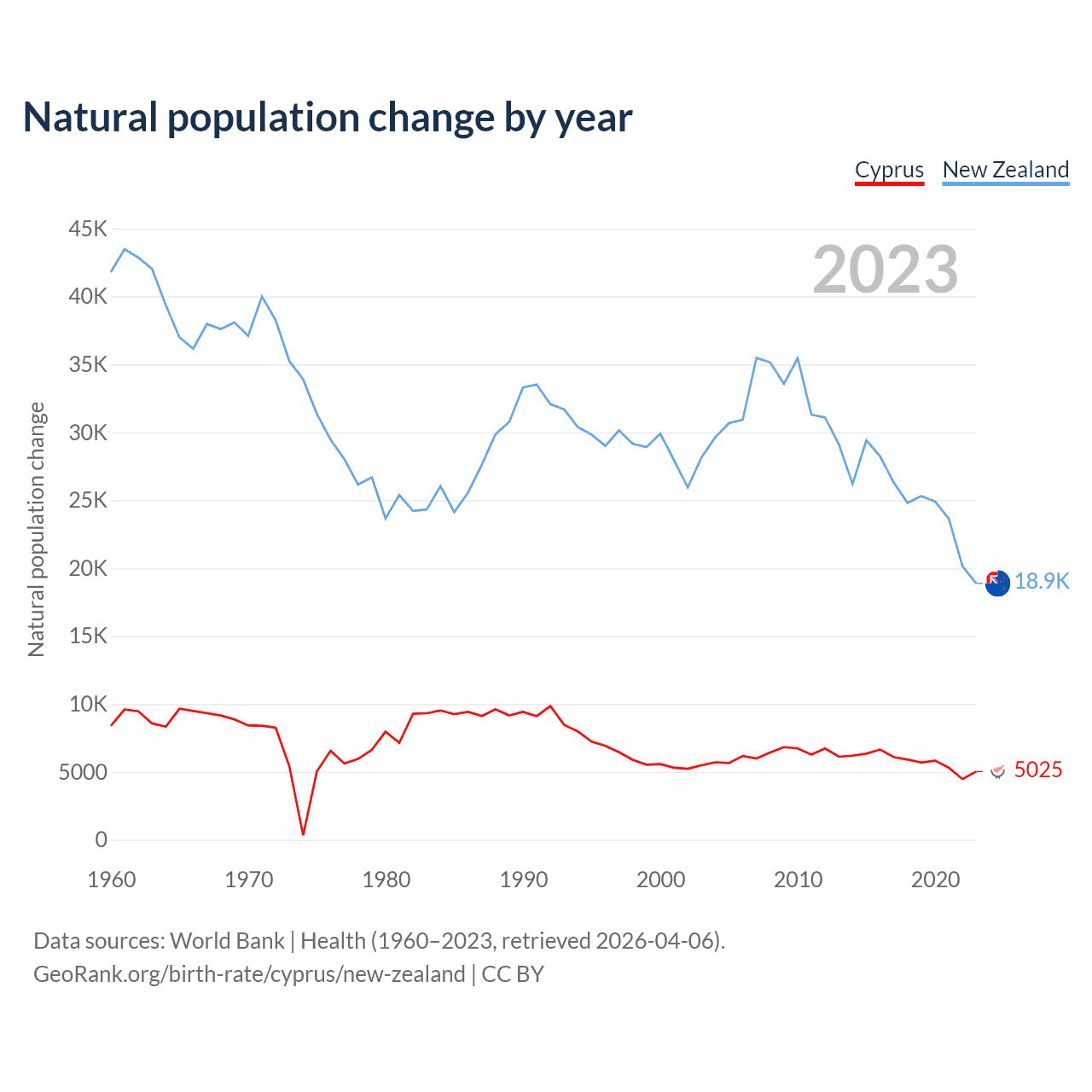 Cyprus has an annual birth rate of 10.8 births per 1,000 people, compared to 10.9 for New Zealand. The average number of children a woman is expected to have during her lifetime — the fertility rate, is 1.39 in Cyprus and 1.56 in New Zealand — 12.3% difference.