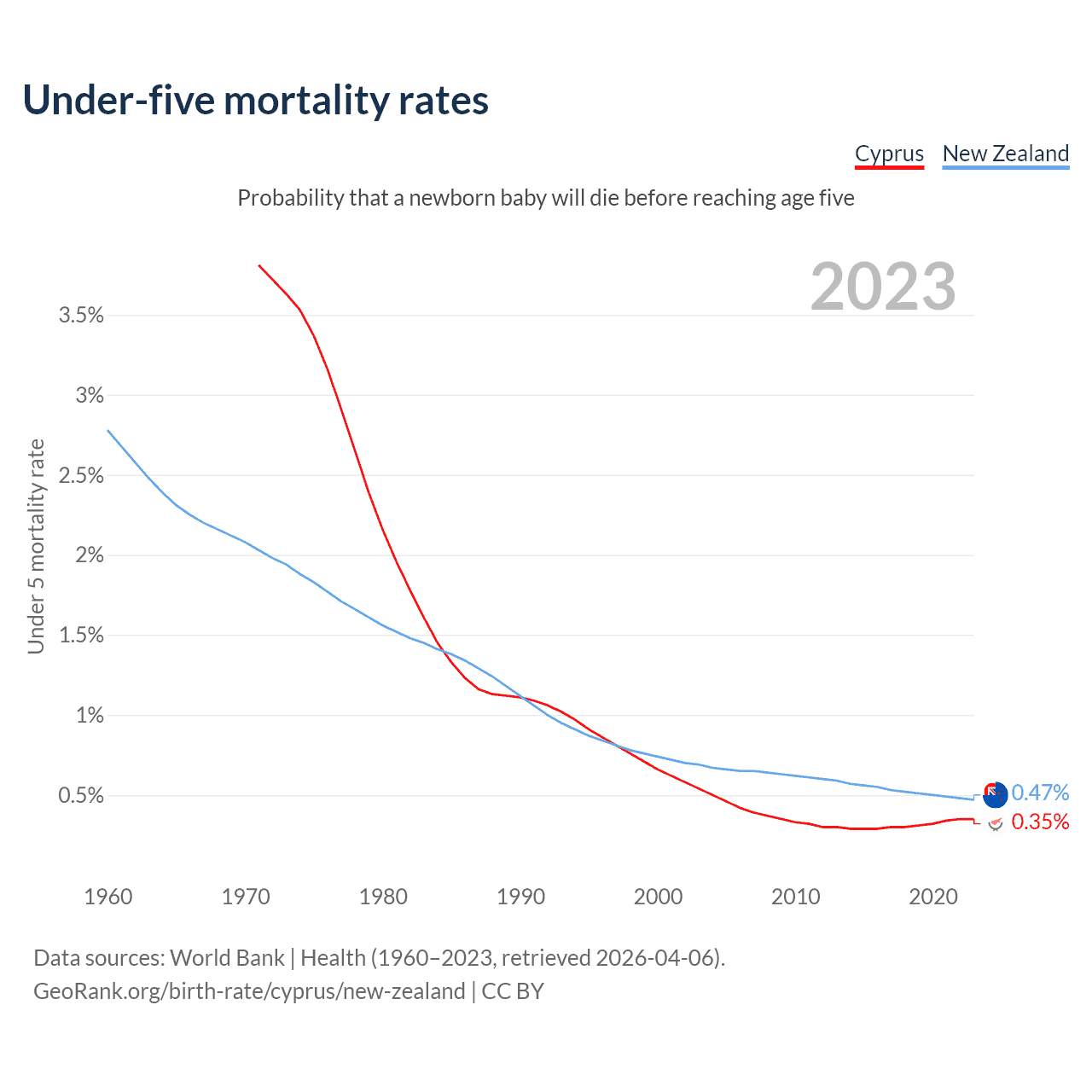 The chance that a newborn baby will die before reaching age five is 0.35% in Cyprus and 0.47% in New Zealand. Above is a chart with historical data on under-five mortality rates.