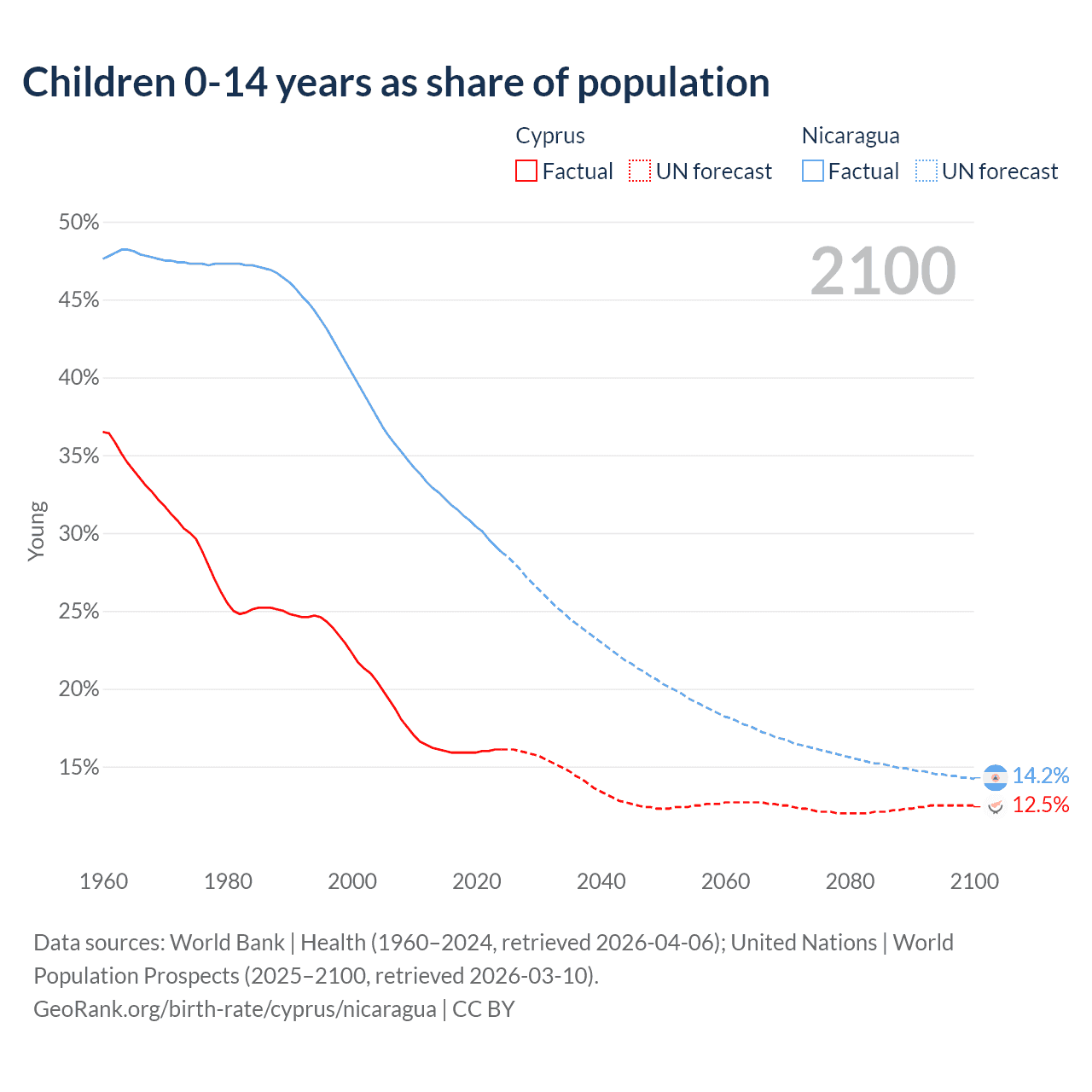 According to the latest available data on birth rates, the fertility rate in Cyprus was 1.39 children per woman in 2023, compared to 2.22 in Nicaragua in 2023. The replacement level is considered to be 2.1 children per woman.