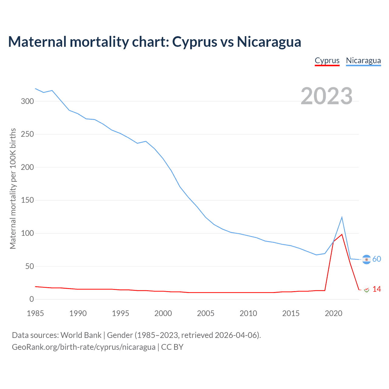 The maternal mortality rate, which is the probability of dying during childbirth or within 42 days of pregnancy termination, is 14 deaths per 100,000 live births in Cyprus, compared to 60 deaths in Nicaragua.