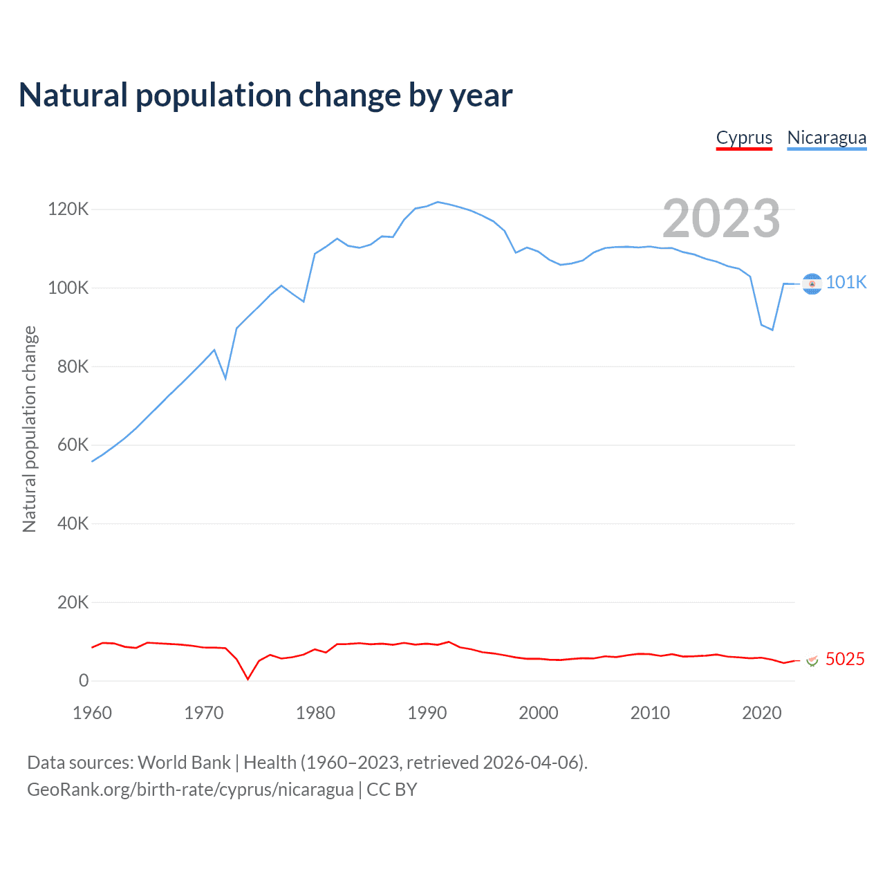Cyprus has an annual birth rate of 10.8 births per 1,000 people, compared to 19.4 for Nicaragua. The average number of children a woman is expected to have during her lifetime — the fertility rate, is 1.39 in Cyprus and 2.22 in Nicaragua — 59.7% difference.