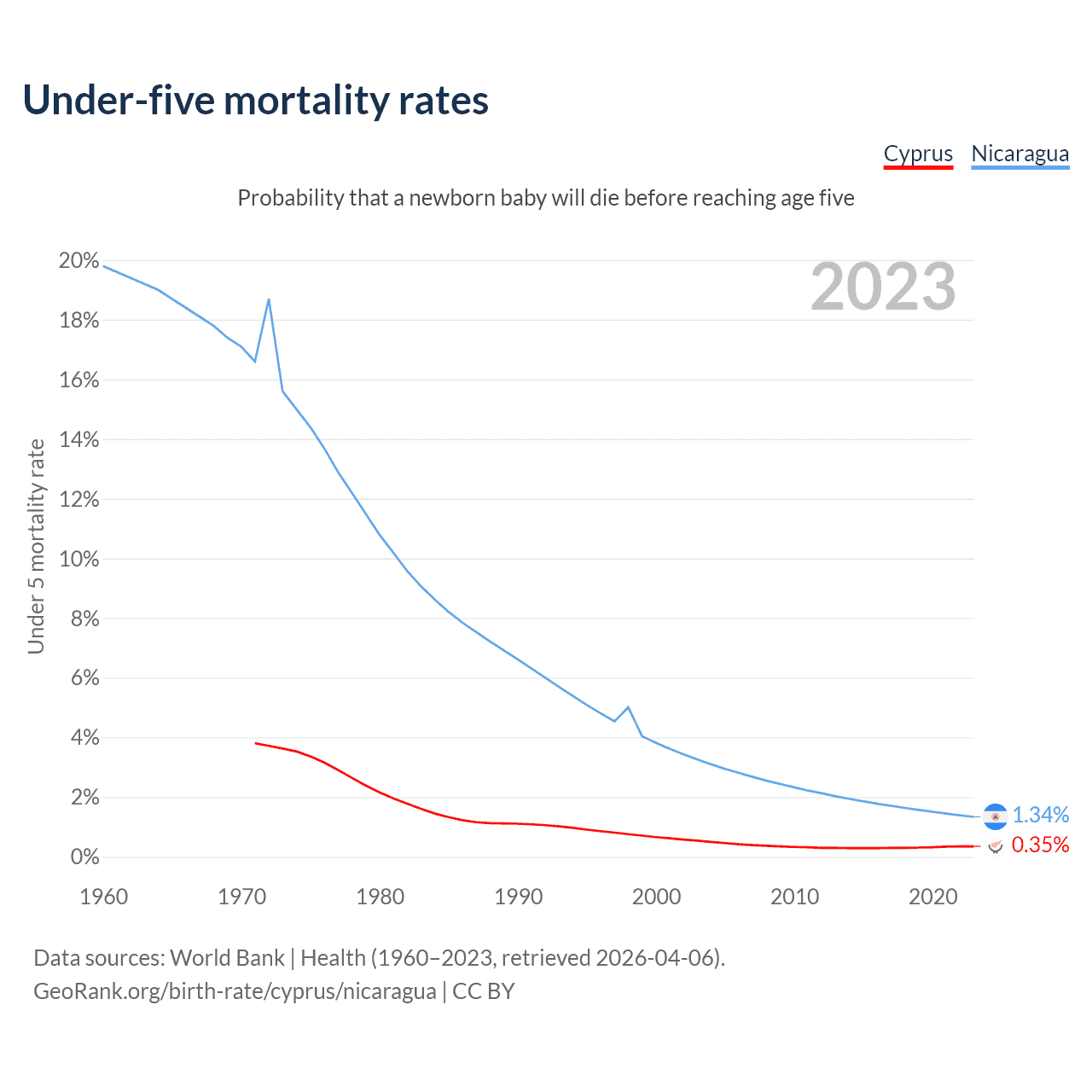 The chance that a newborn baby will die before reaching age five is 0.35% in Cyprus and 1.34% in Nicaragua. Above is a chart with historical data on under-five mortality rates.