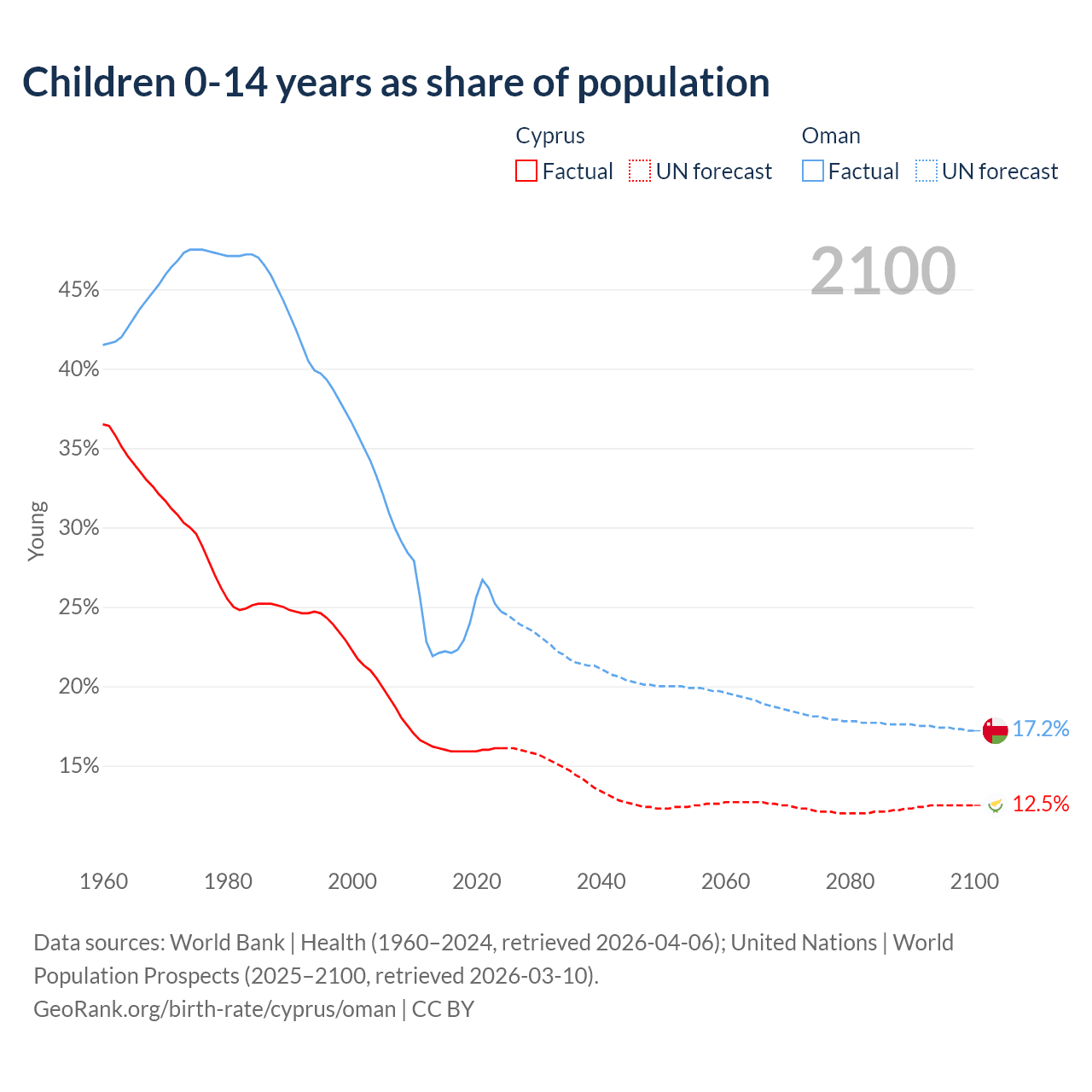 According to the latest available data on birth rates, the fertility rate in Cyprus was 1.39 children per woman in 2023, compared to 2.53 in Oman in 2023. The replacement level is considered to be 2.1 children per woman.
