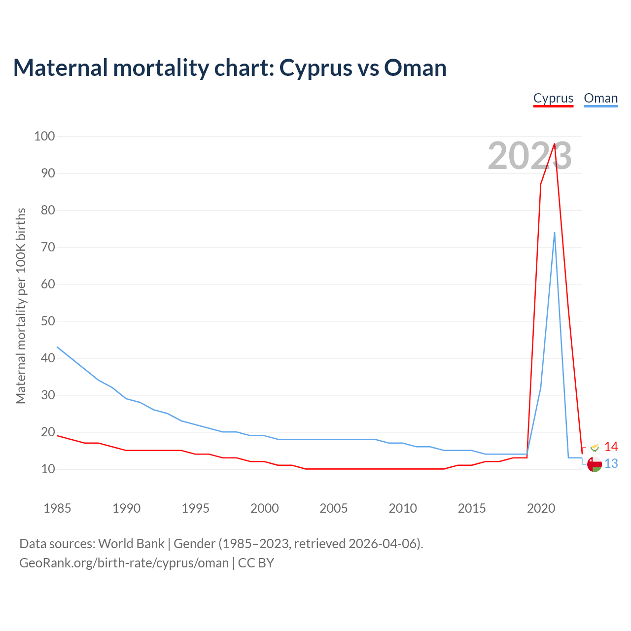 The maternal mortality rate, which is the probability of dying during childbirth or within 42 days of pregnancy termination, is 14 deaths per 100,000 live births in Cyprus, compared to 13 deaths in Oman.