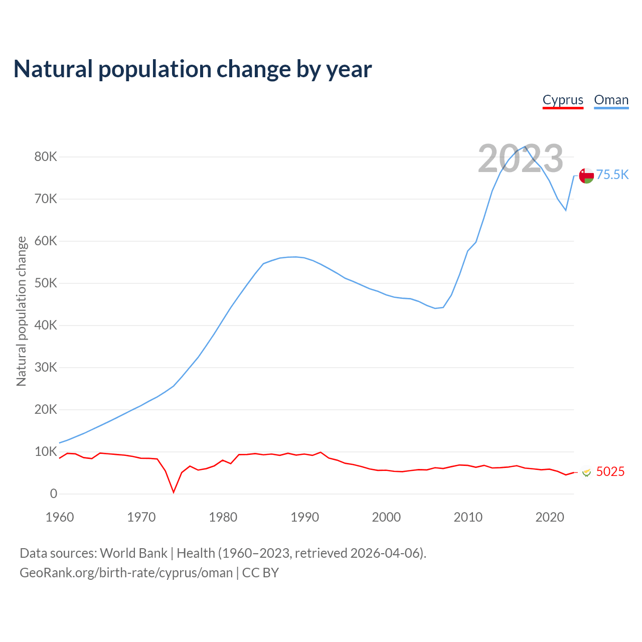 Cyprus has an annual birth rate of 10.8 births per 1,000 people, compared to 16.8 for Oman. The average number of children a woman is expected to have during her lifetime — the fertility rate, is 1.39 in Cyprus and 2.53 in Oman — 81.8% difference.