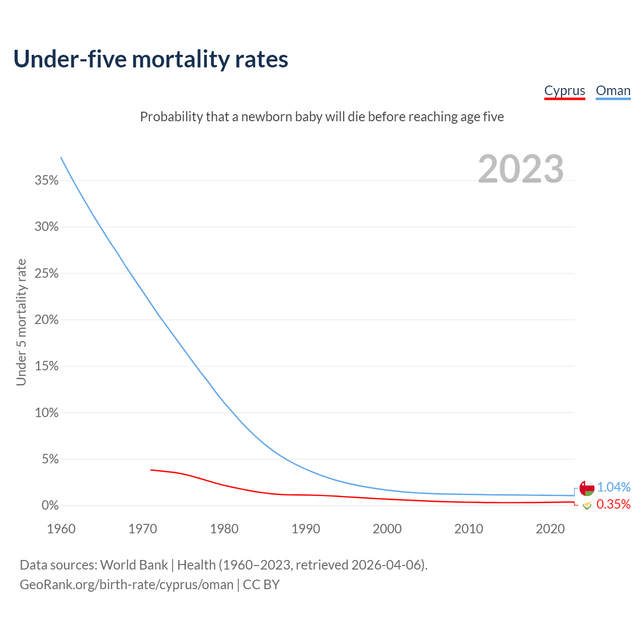 The chance that a newborn baby will die before reaching age five is 0.35% in Cyprus and 1.04% in Oman. Above is a chart with historical data on under-five mortality rates.