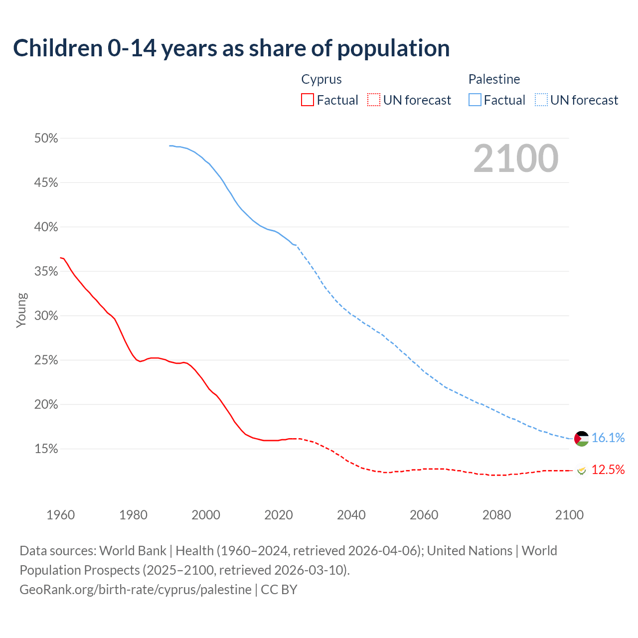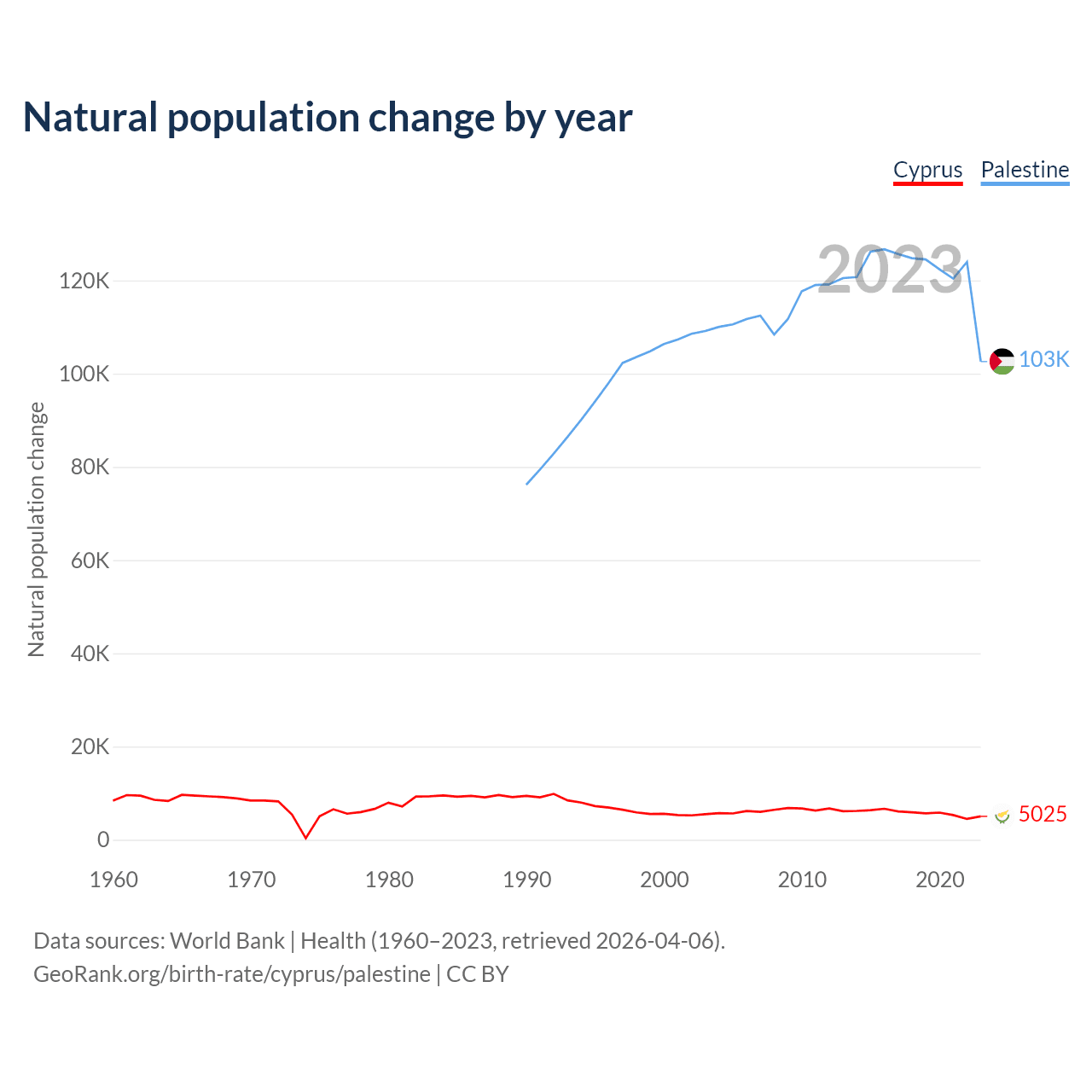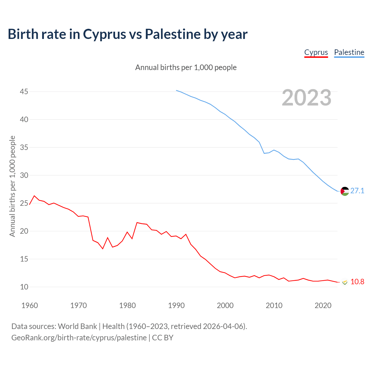 According to the latest available data on birth rates, the fertility rate in Cyprus was 1.39 children per woman in 2023, compared to 3.31 in Palestine in 2023. The replacement level is considered to be 2.1 children per woman.